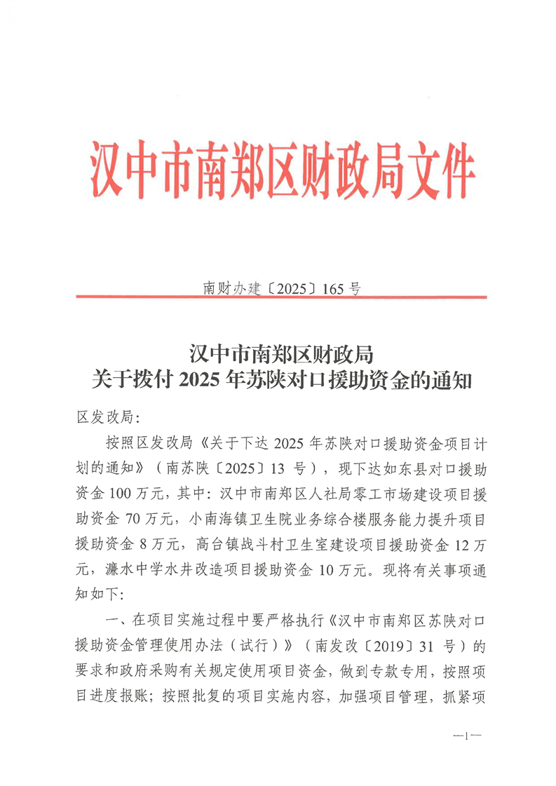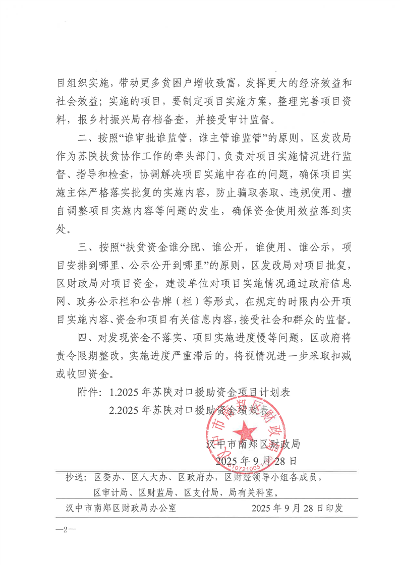 汉中市南郑区财政局关于拨付2025年苏陕对口援助资金的通知