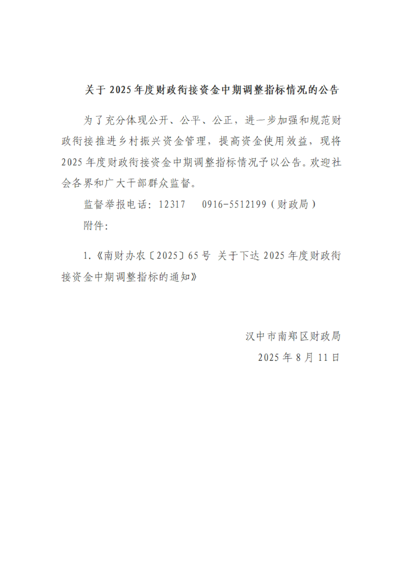 关于2025年度财政衔接资金中期调整指标情况的公告