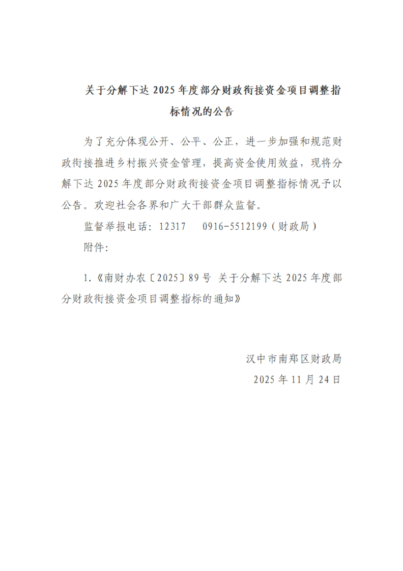 关于分解下达2025年度部分财政衔接资金项目调整指标情况的公告