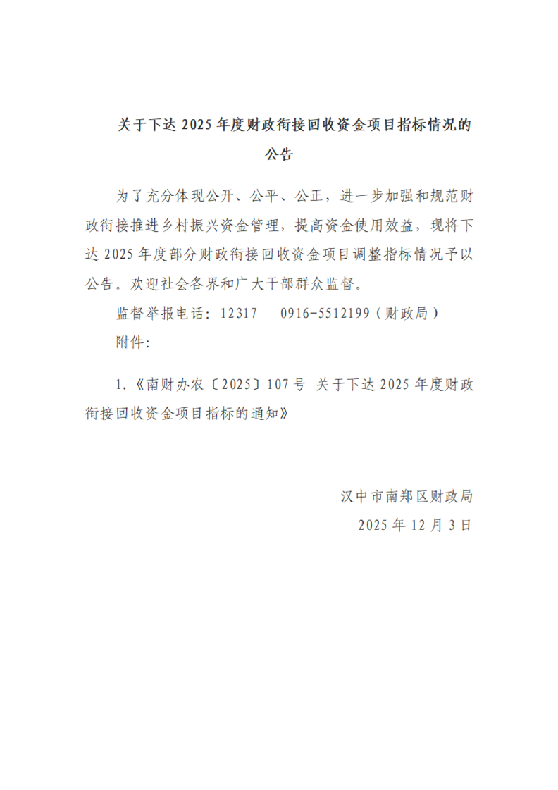 关于下达2025年度财政衔接回收资金项目指标情况的公告