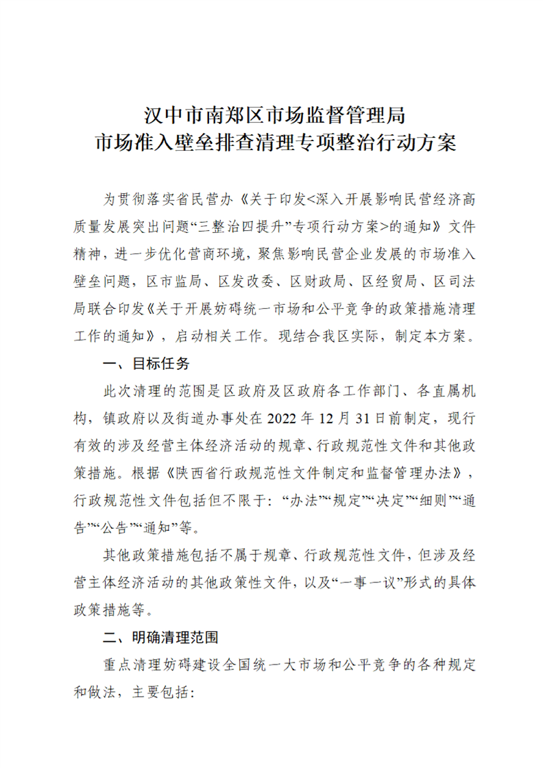 汉中市南郑区市场监督管理局市场准入壁垒排查清理专项整治行动方案
