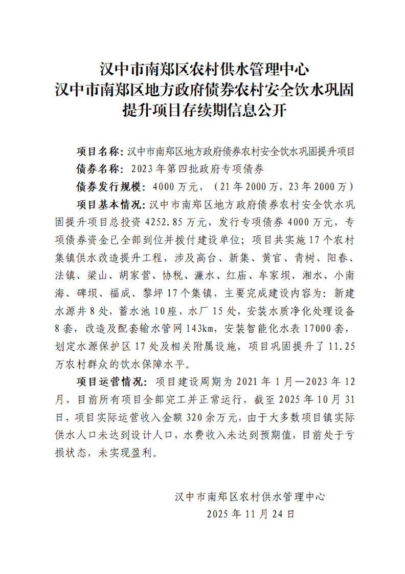 汉中市南郑区农村供水管理中心汉中市南郑区地方政府债券农村安全饮水巩固提升项目存续...