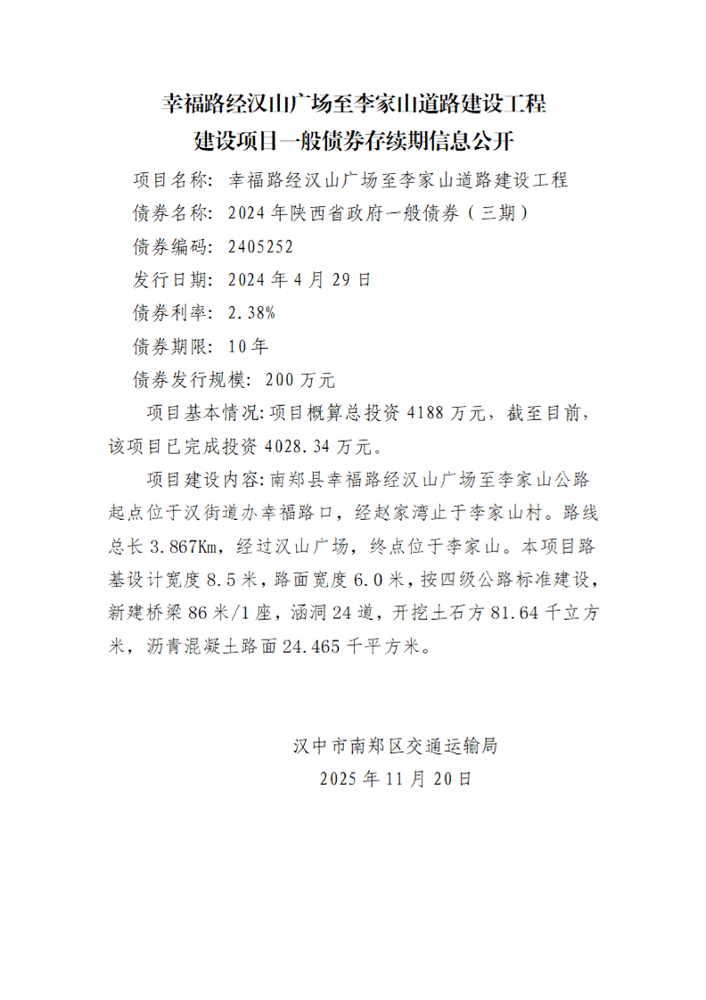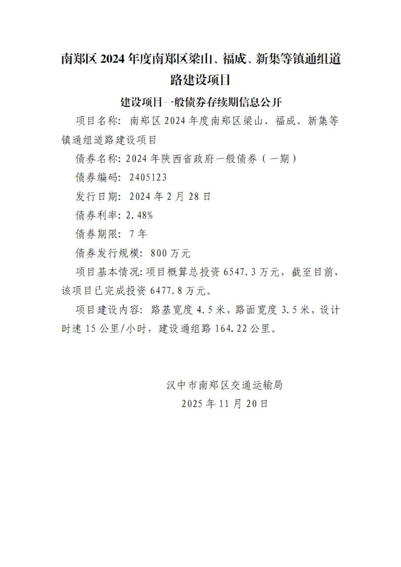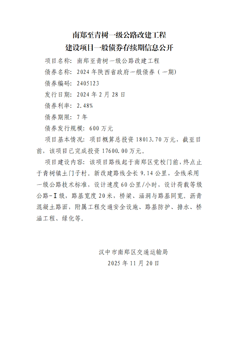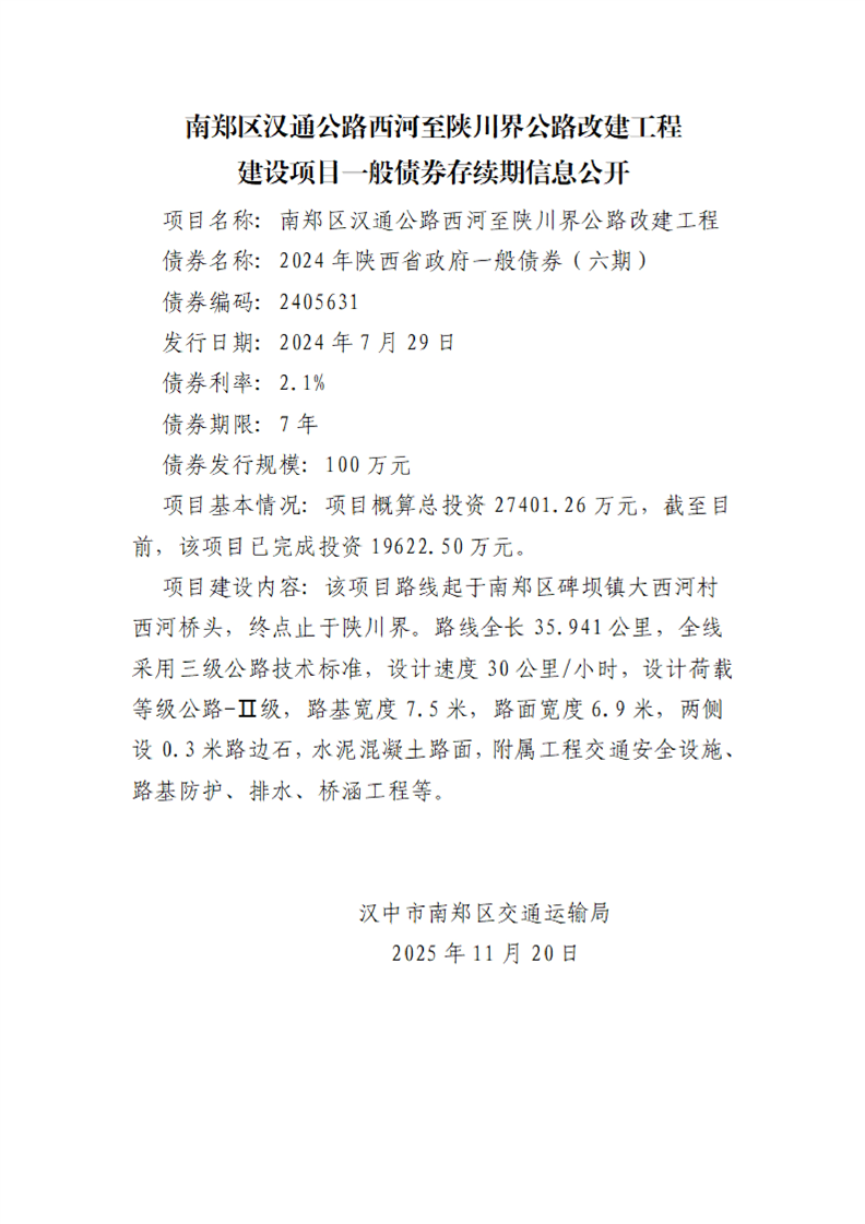 南郑区交通运输局建设项目一般债券存续期信息公开