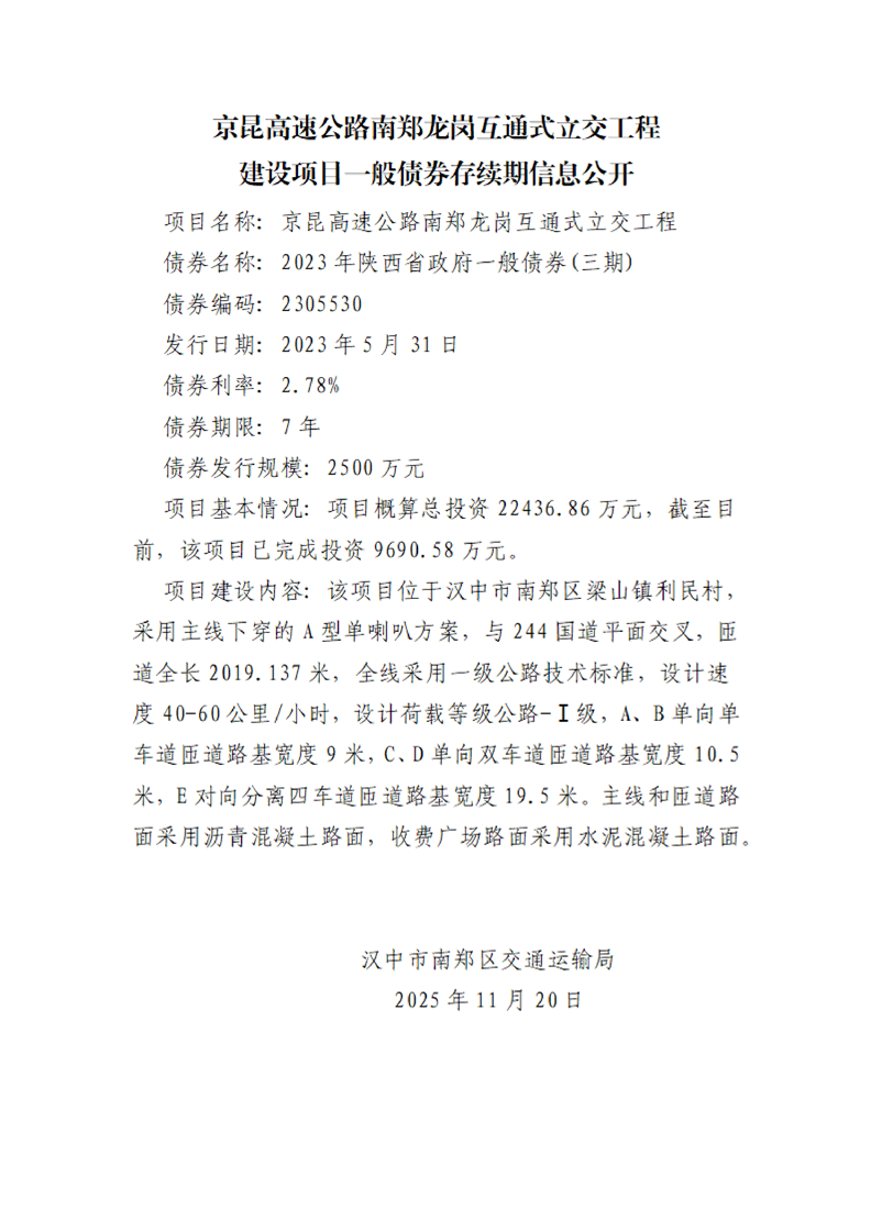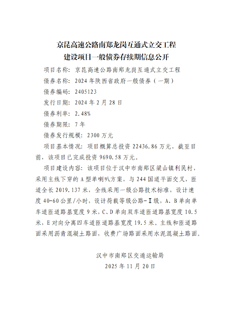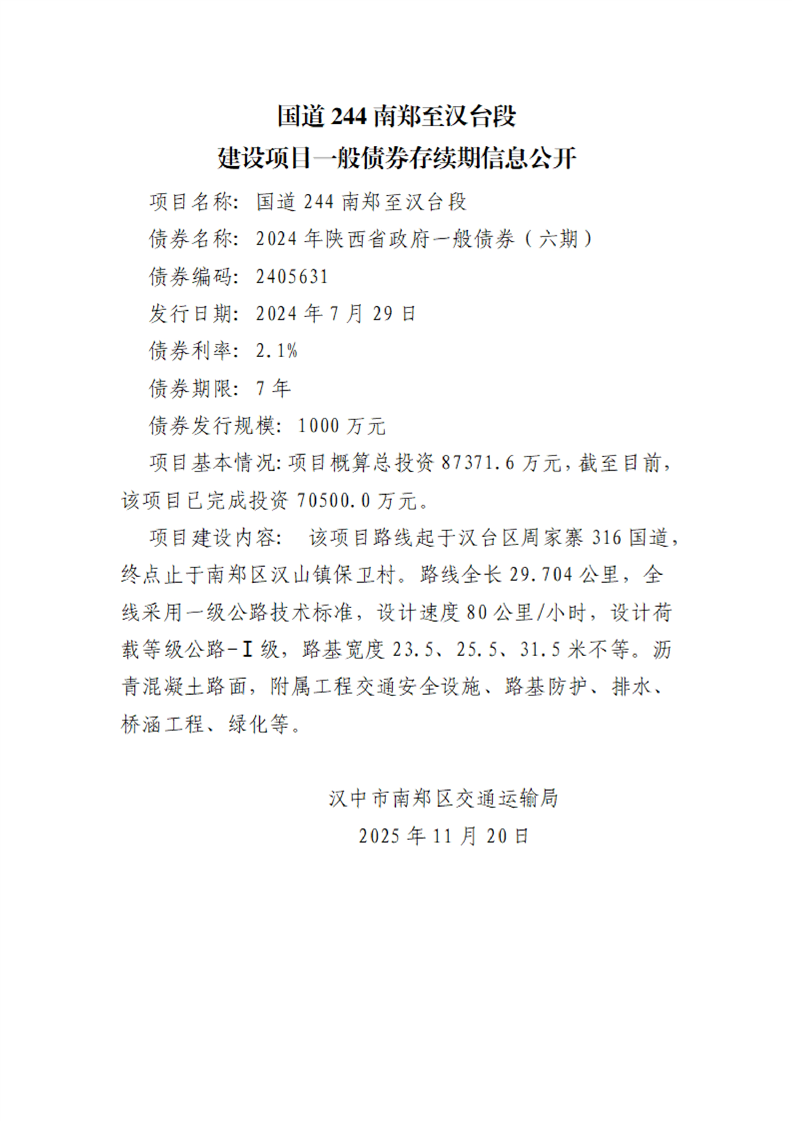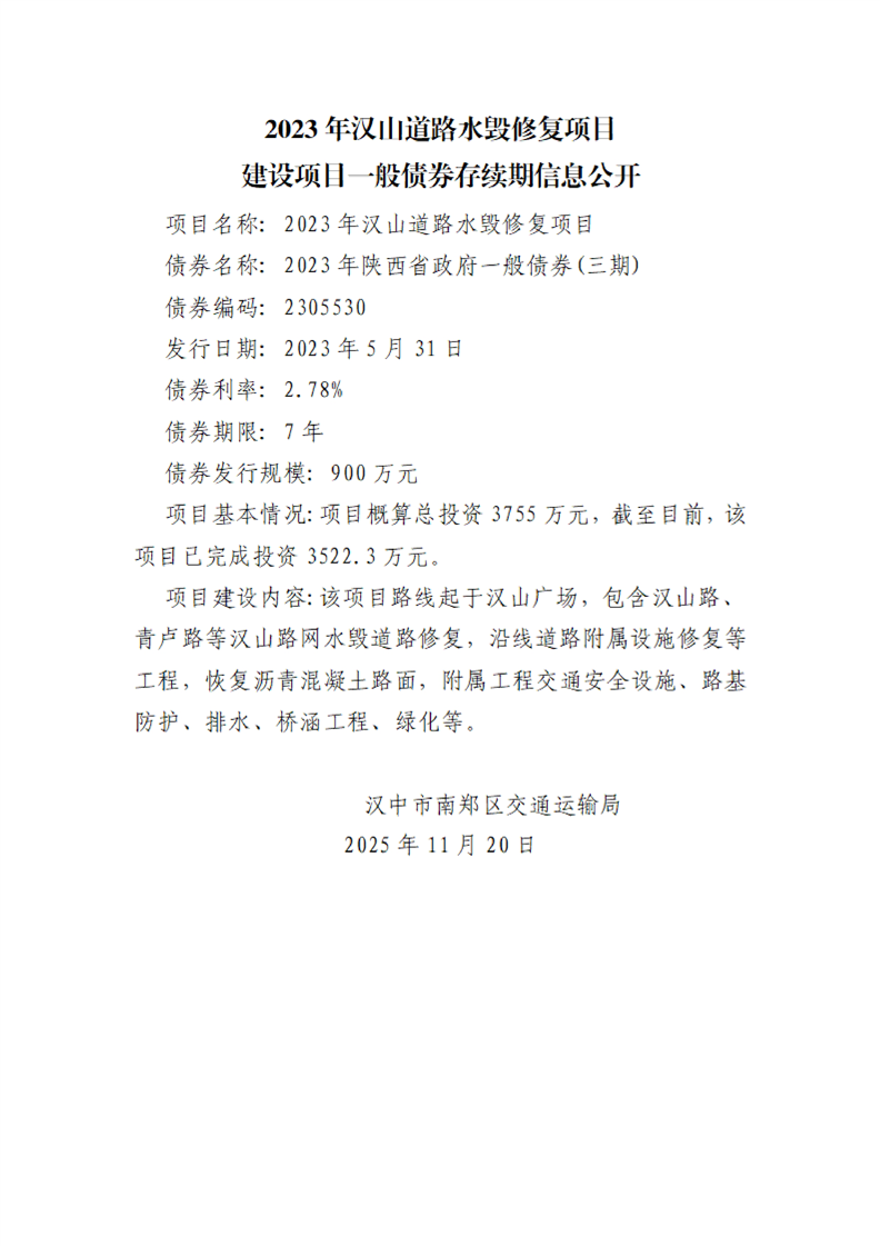 南郑区交通运输局建设项目一般债券存续期信息公开