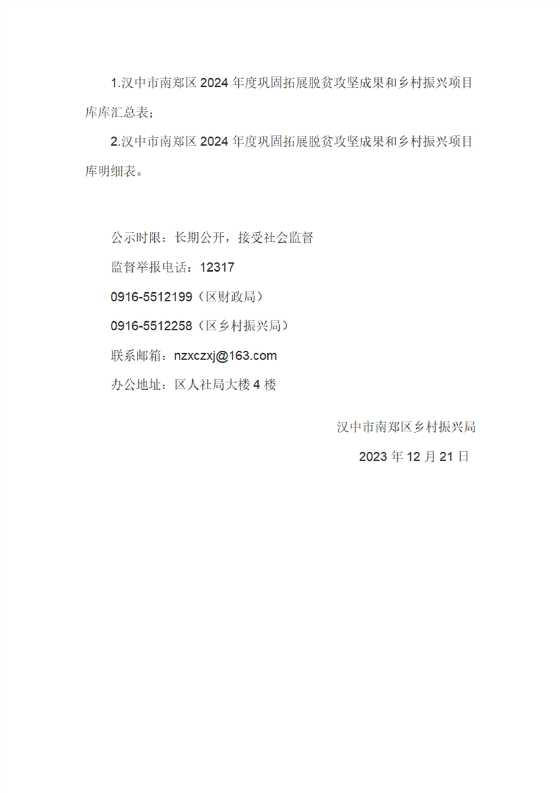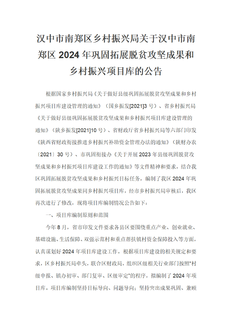 汉中市南郑区乡村振兴局关于汉中市南郑区2024年巩固拓展脱贫攻坚成果和乡村振兴项目库的公告