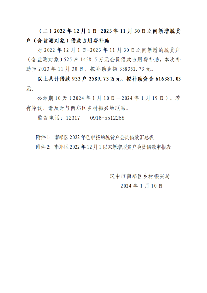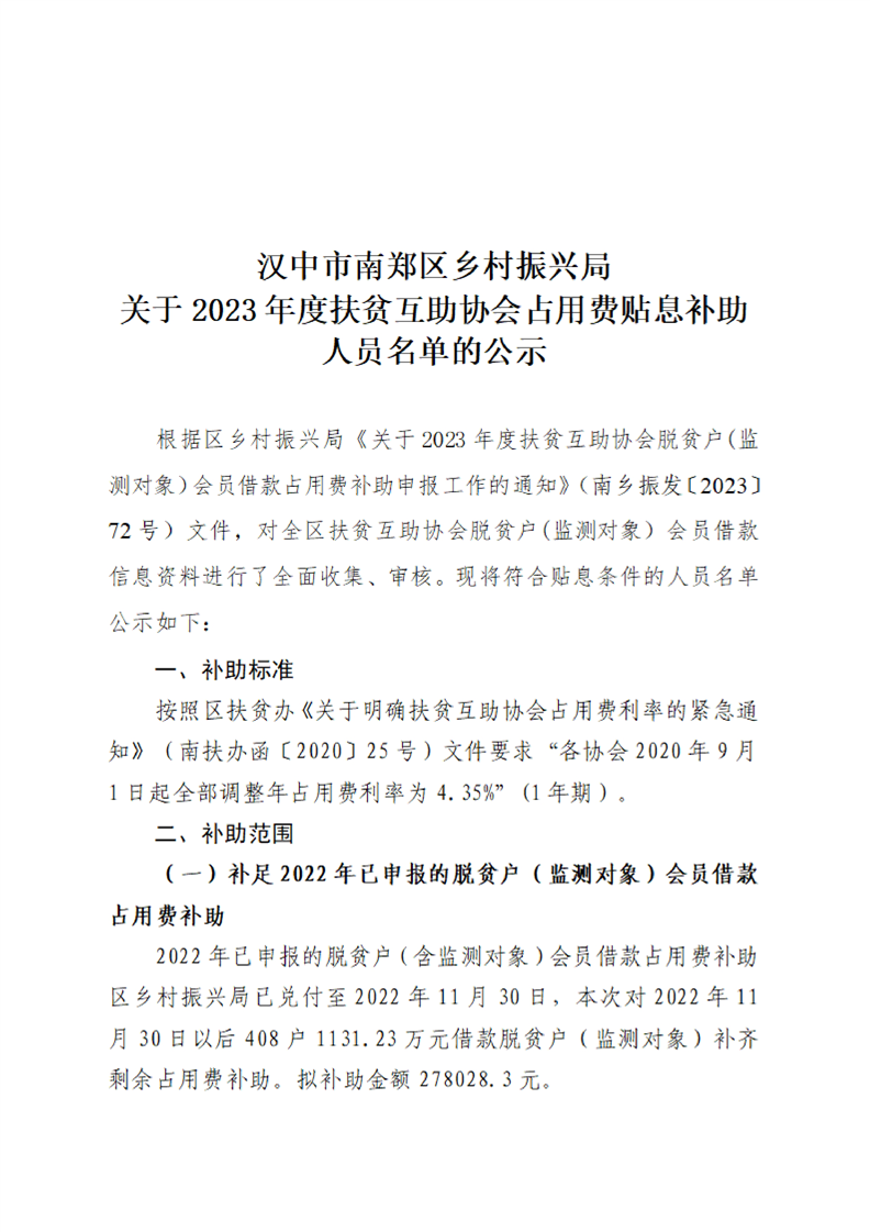 汉中市南郑区乡村振兴局关于2023年度扶贫互助协会占用费贴息补助人员名单的公示