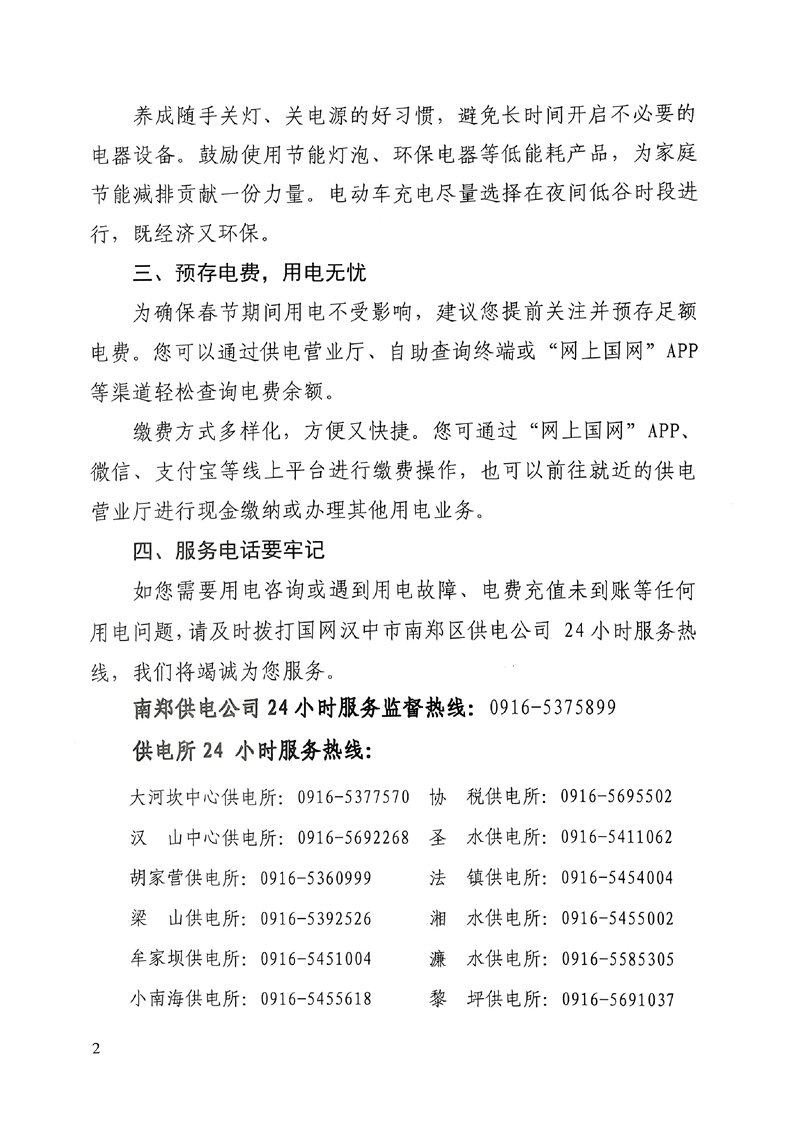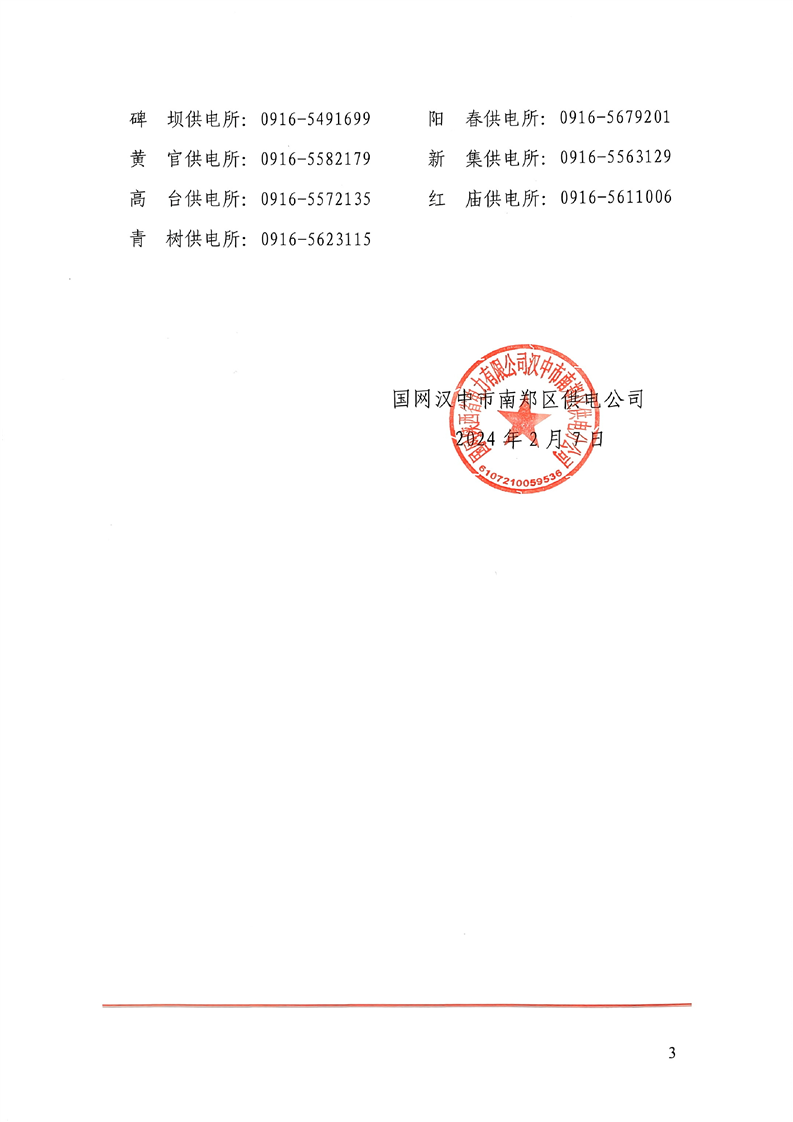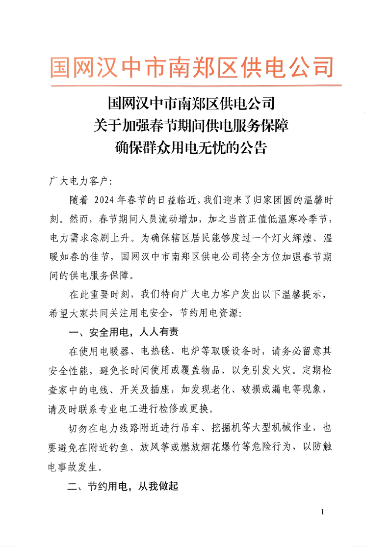国网汉中市南郑区供电公司关于加强春节期间供电服务保障确保群众用电无忧的公告