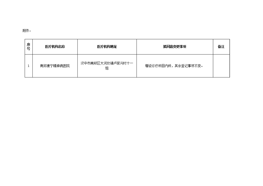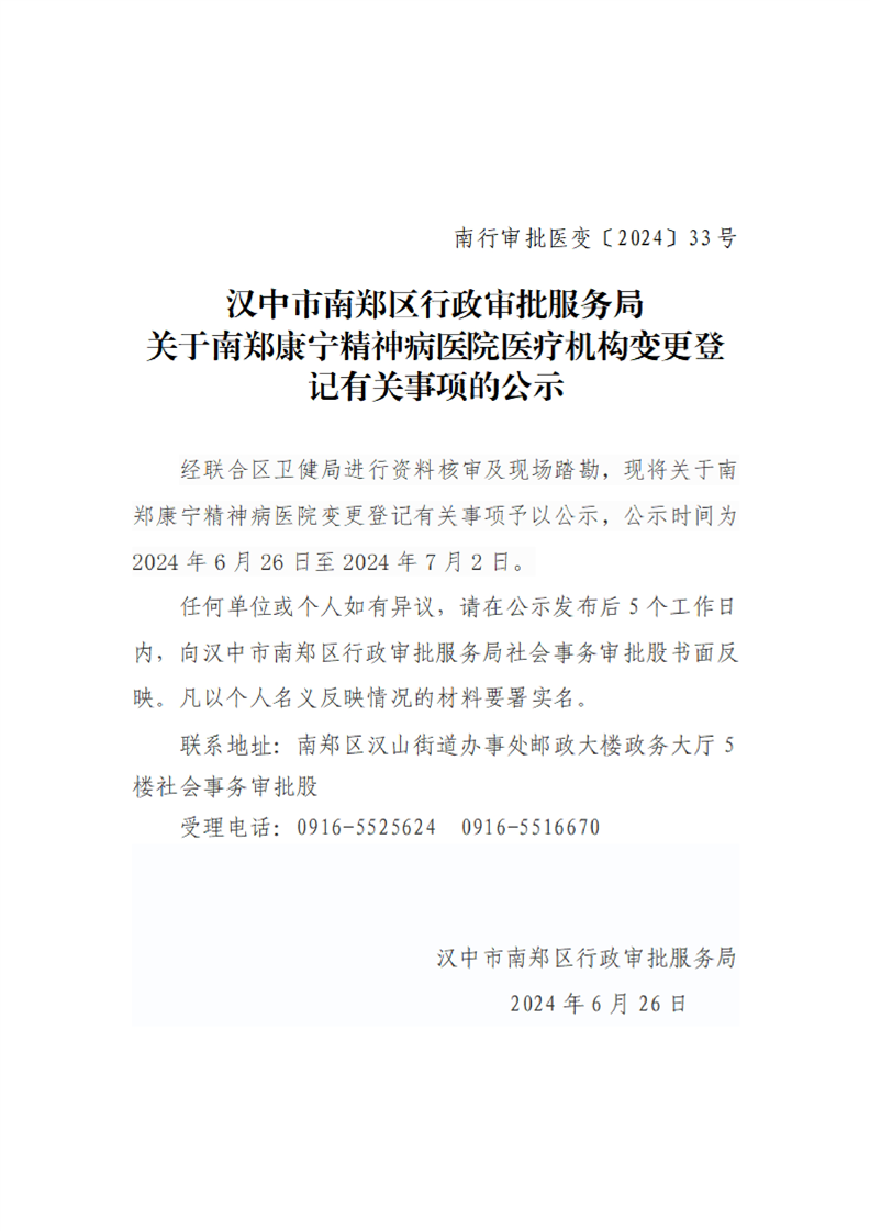 汉中市南郑区行政审批服务局关于南郑康宁精神病医院医疗机构变更登记有关事项的公示