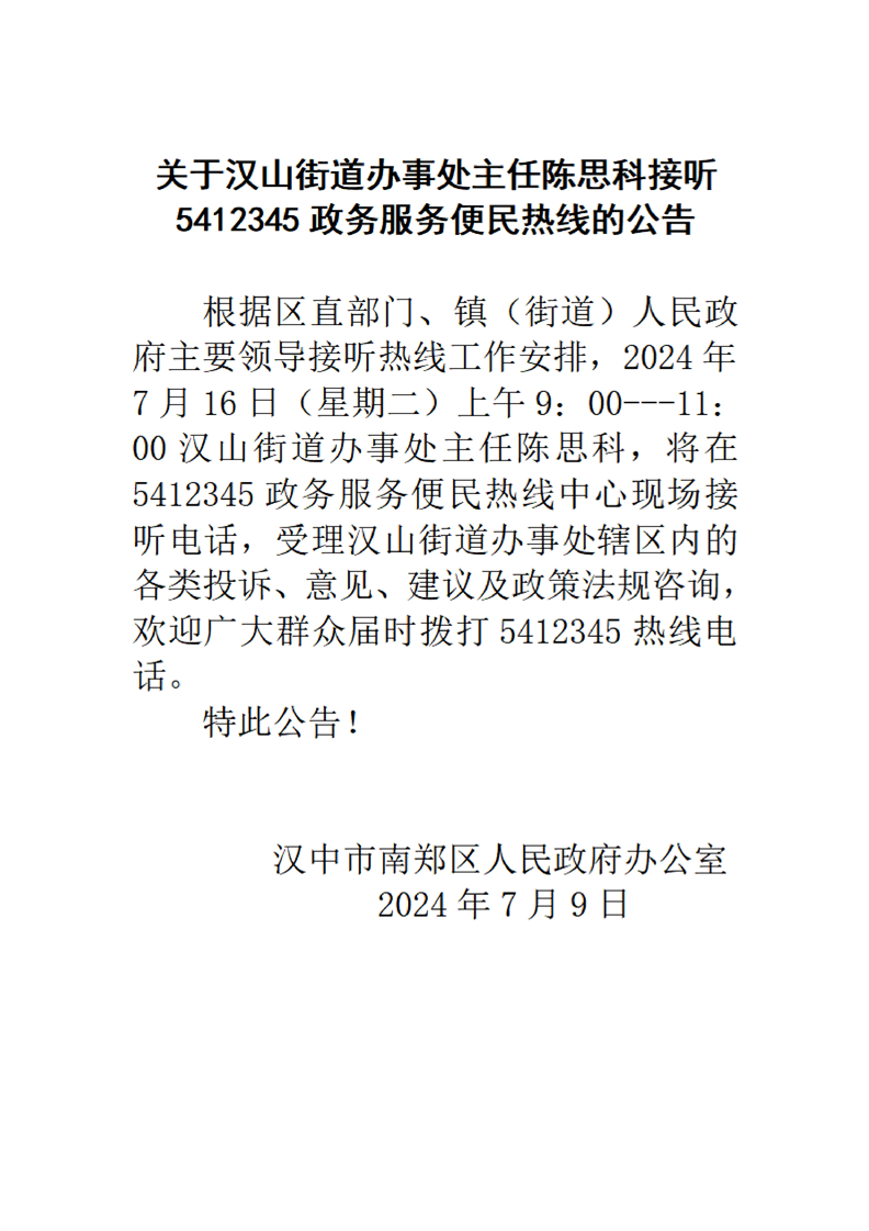 关于汉山街道办事处主任陈思科接听5412345政务服务便民热线的公告