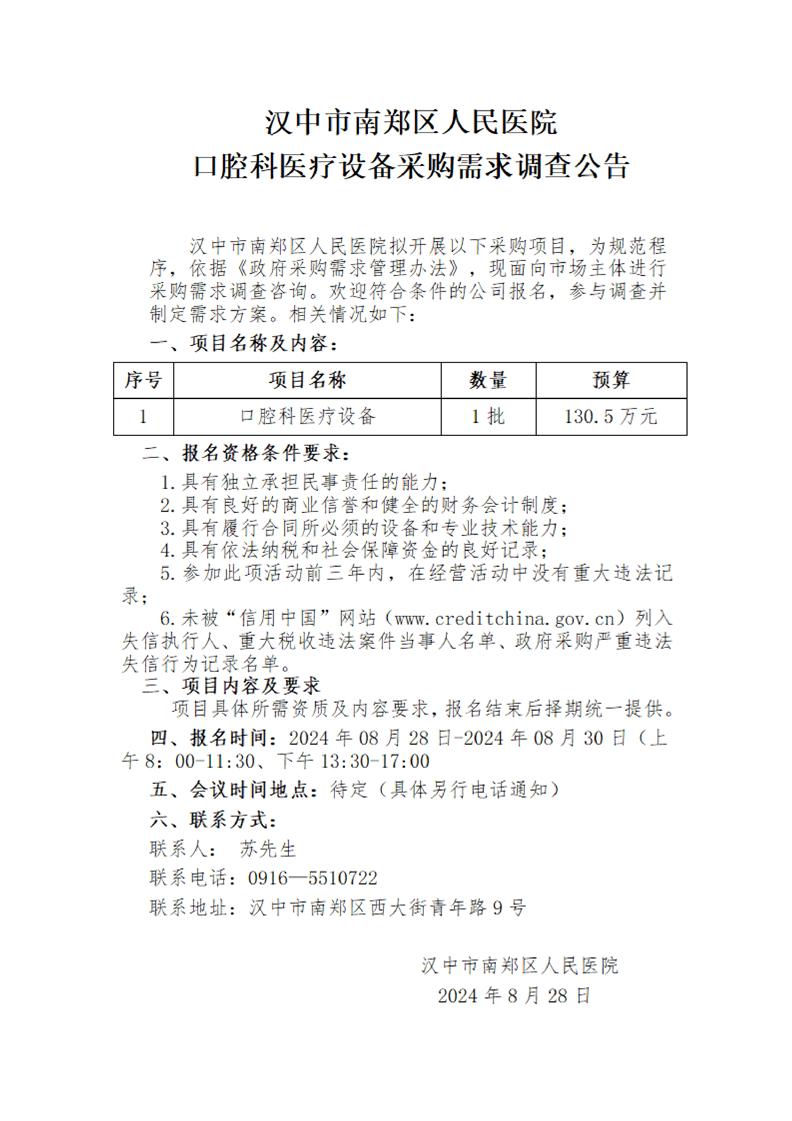 汉中市南郑区人民医院口腔科医疗设备采购需求调查公告