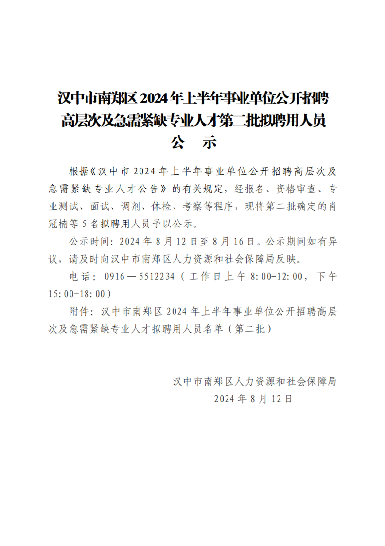 附件:汉中市南郑区2024年上半年事业单位公开招聘高层次及急需紧缺专业人才拟聘用人员名单(第二批)