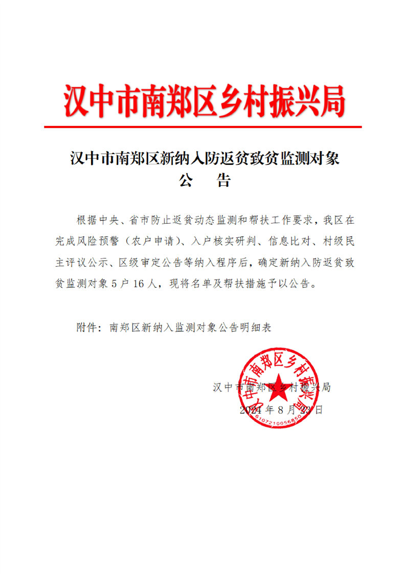 汉中市南郑区新纳入防返贫致贫监测对象公告