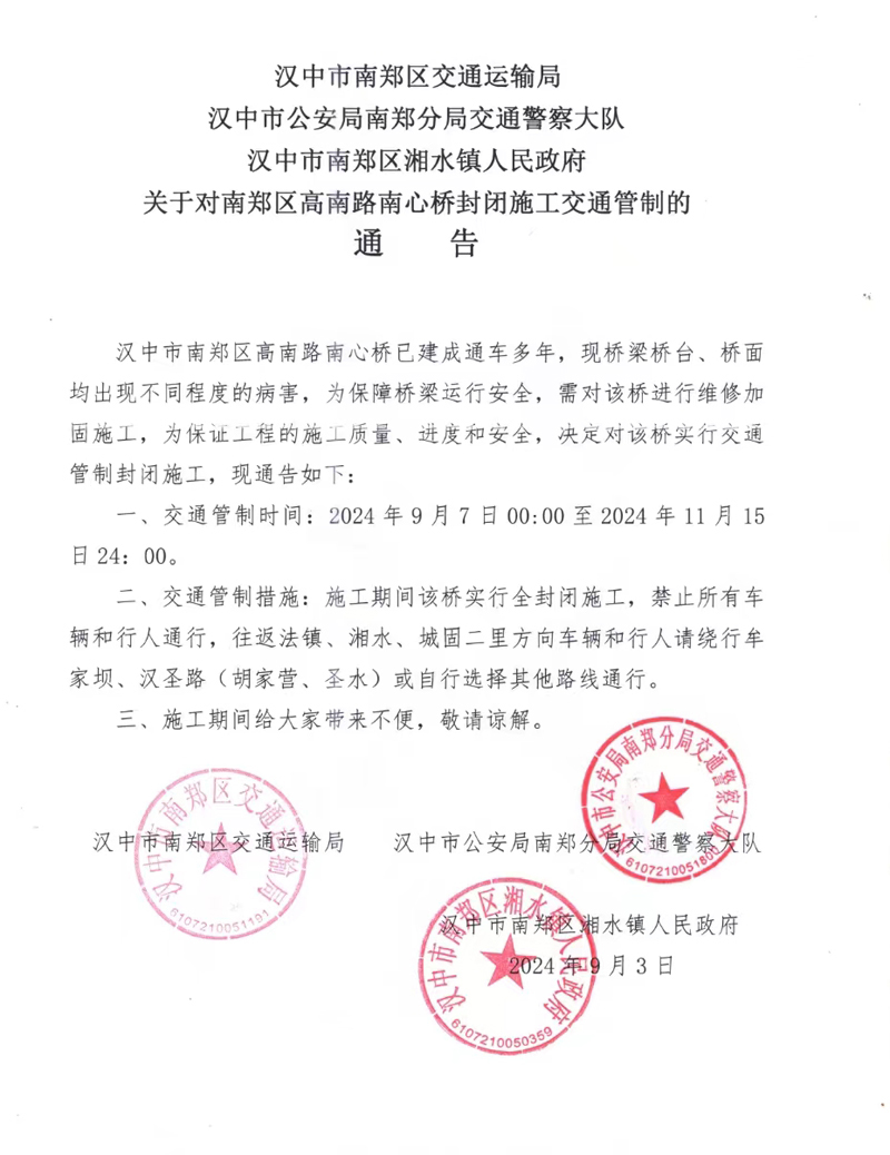 关于对南郑区高南路南心桥封闭施工交通管制的通告