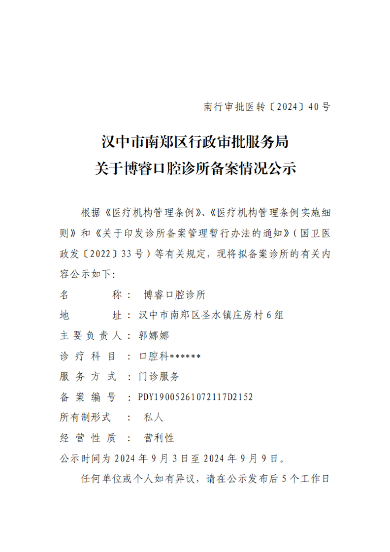 汉中市南郑区行政审批服务局关于博睿口腔诊所备案情况公示