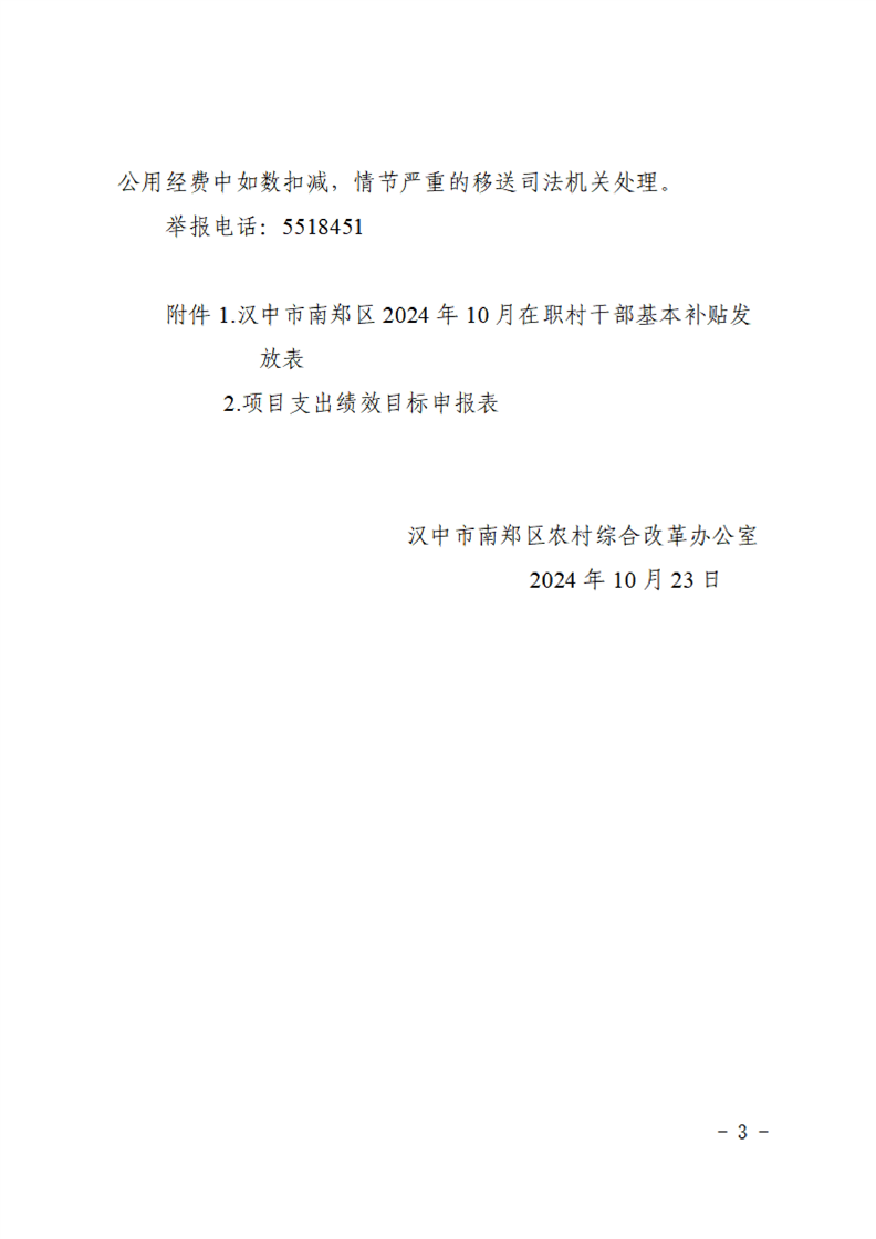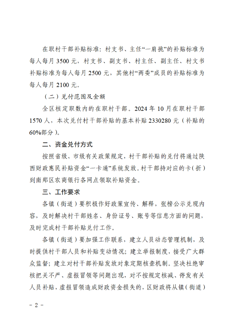 汉中市南郑区农村综合改革办公室关于兑付2024年10月份在职村干部基本补贴的通知