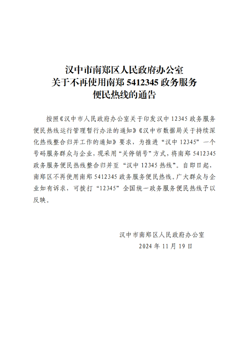 汉中市南郑区人民政府办公室关于不再使用南郑5412345政务服务便民热线的通告