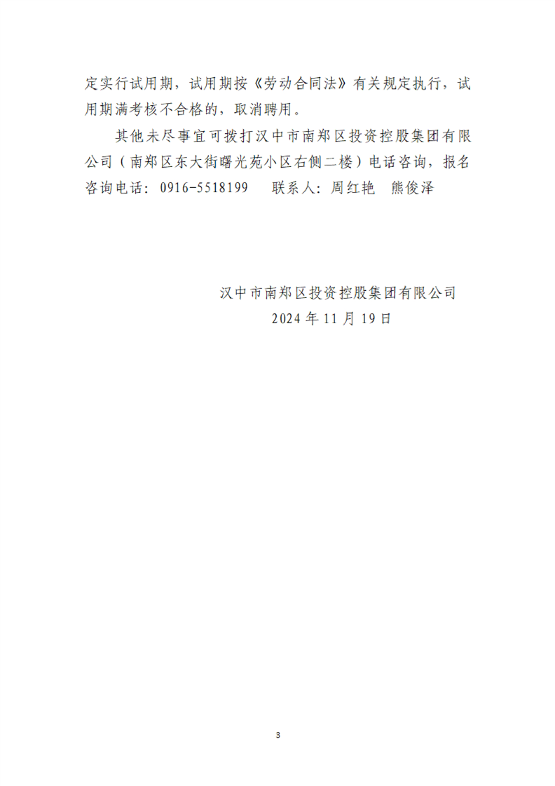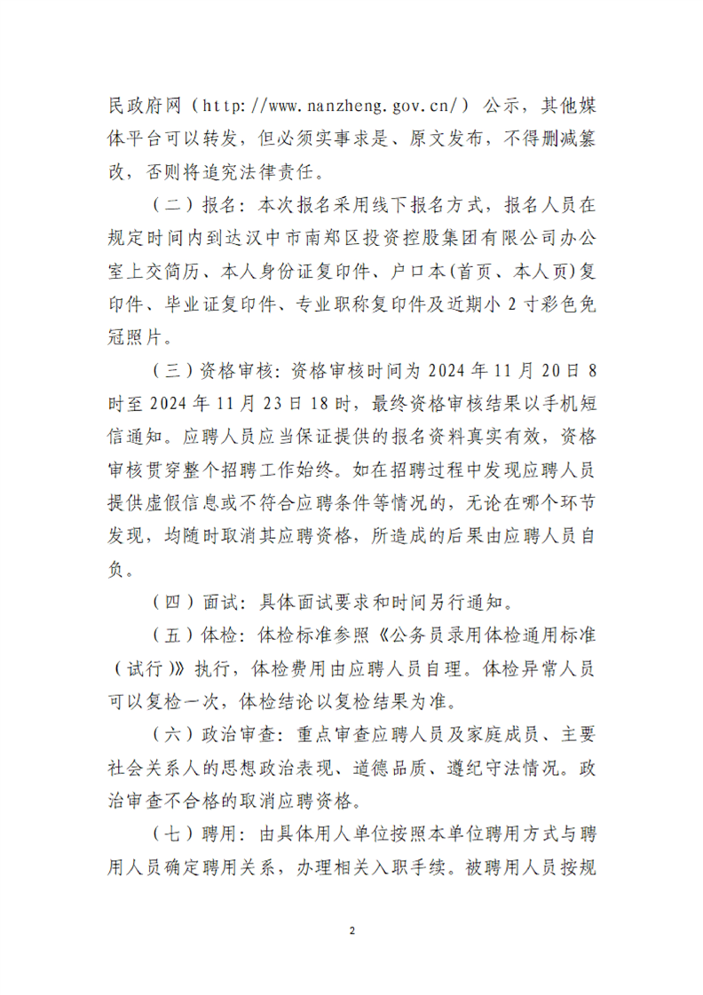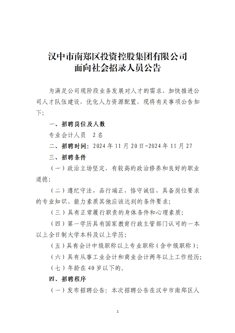 汉中市南郑区投资控股集团有限公司面向社会招录人员公告