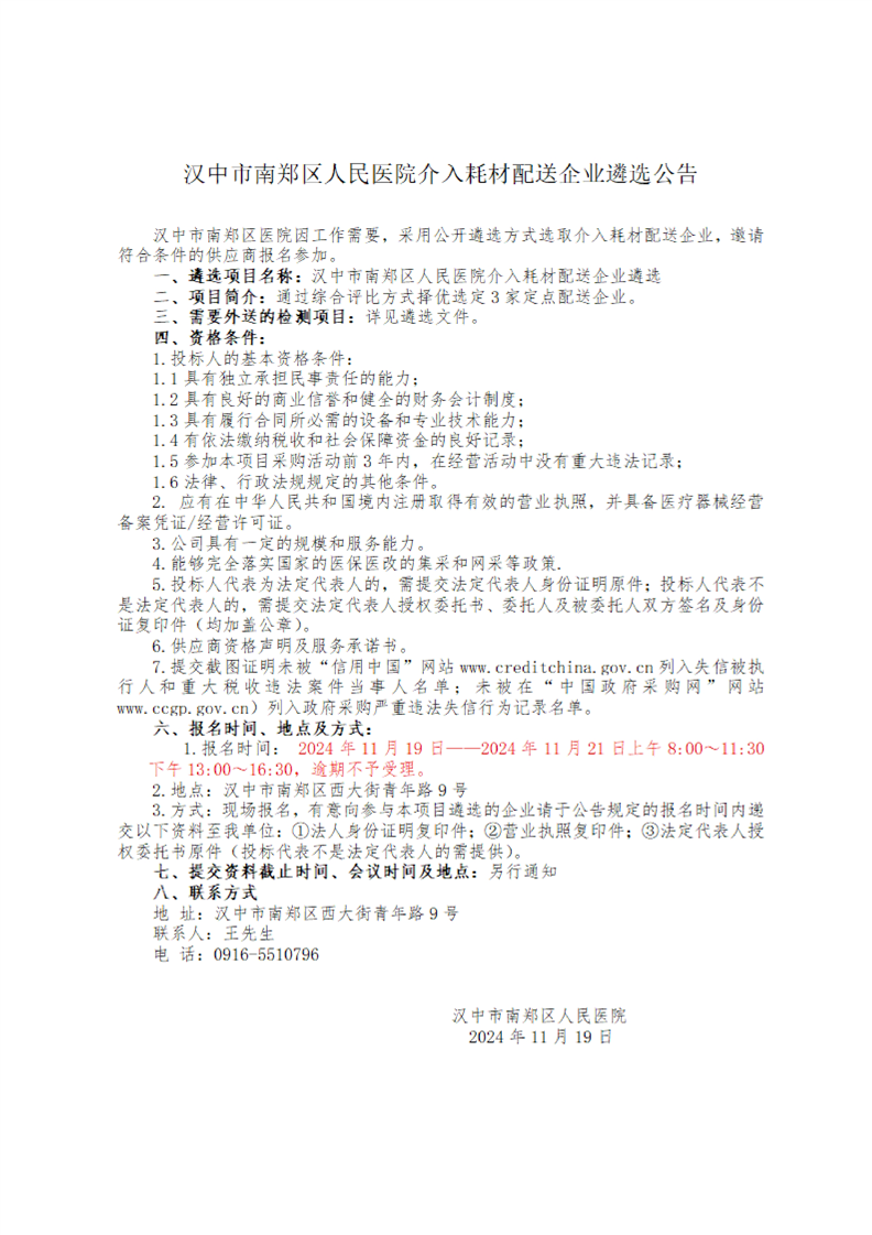汉中市南郑区人民医院介入耗材配送企业遴选公告