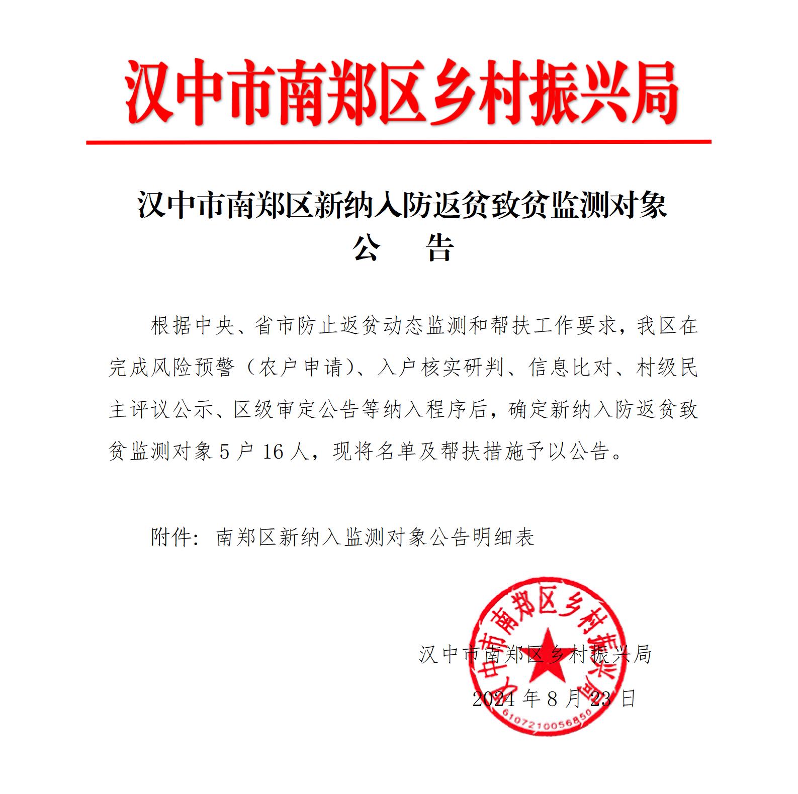 汉中市南郑区新纳入防返贫致贫监测对象公告