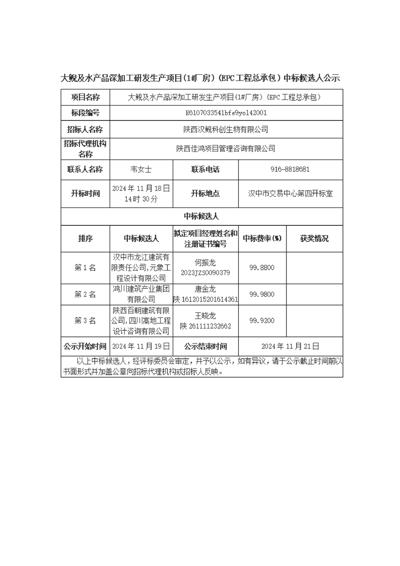 大鲵及水产品深加工研发生产项目(1#厂房)(EPC工程总承包)中标候选人公示