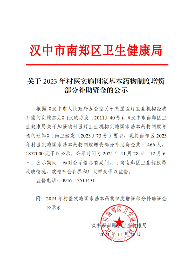 关于2023年村医实施国家基本药物制度增资部分补助资金的公示