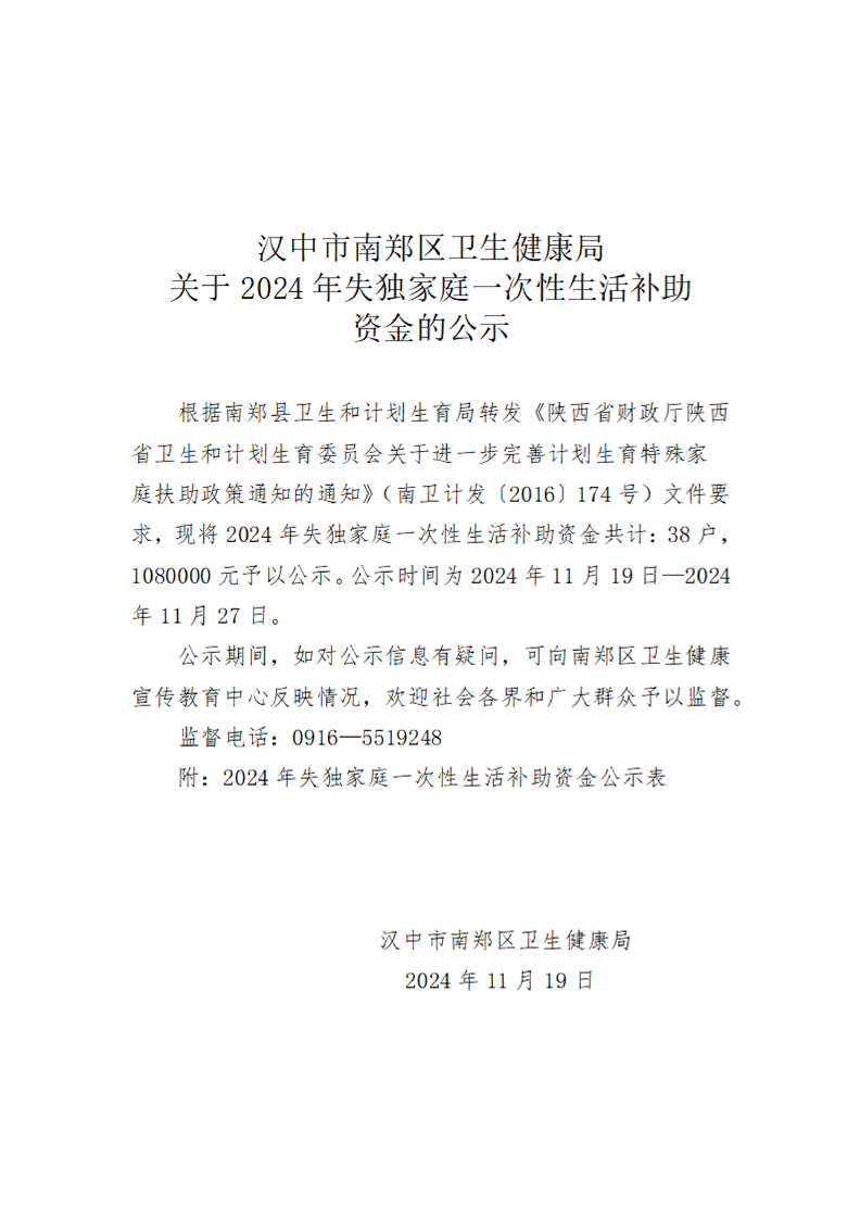 汉中市南郑区卫生健康局关于2024年失独家庭一次性生活补助资金的公示