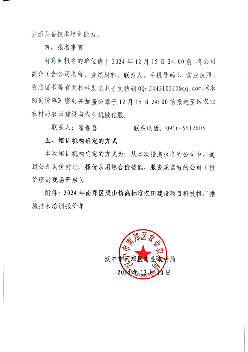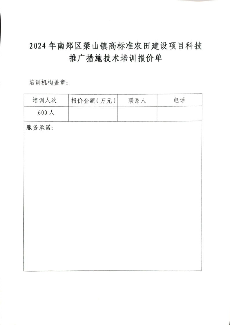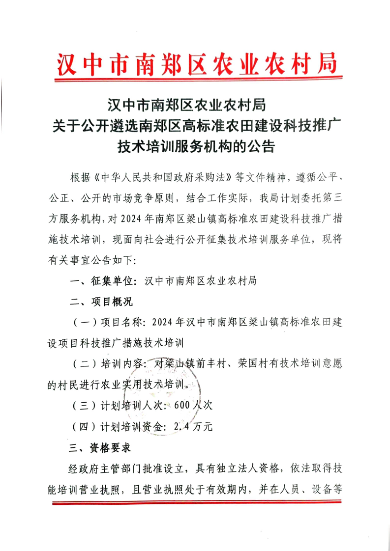 汉中市南郑区农业农村局关于公开遴选南郑区高标准农田建设科技推广技术培训服务机构的公告