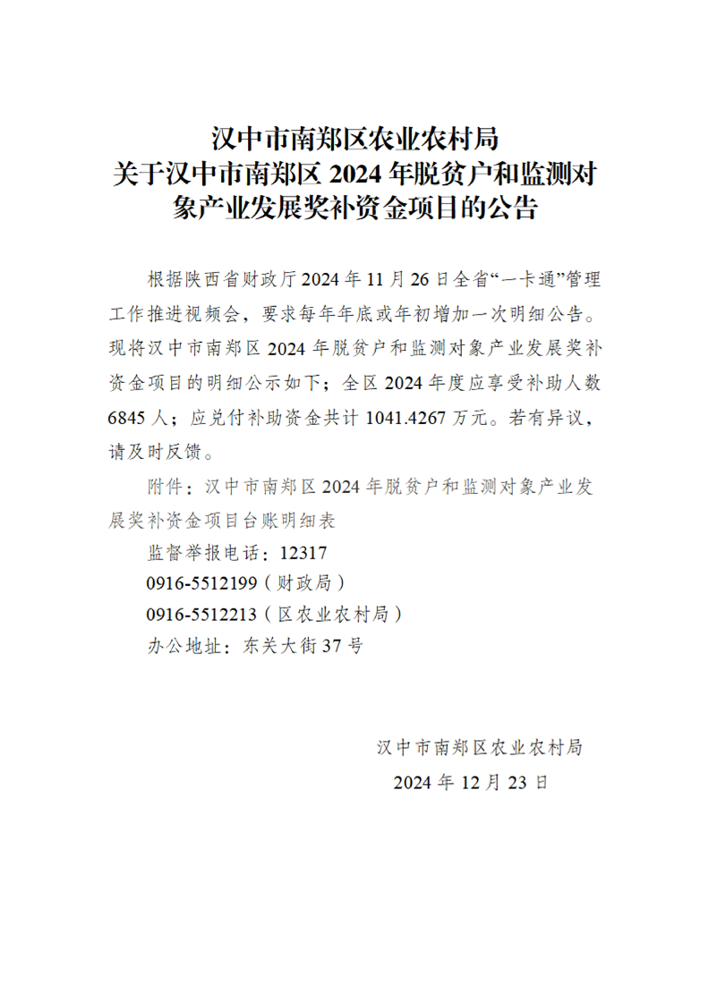 汉中市南郑区农业农村局关于汉中市南郑区2024年脱贫户和监测对象产业发展奖补资金项目的公告