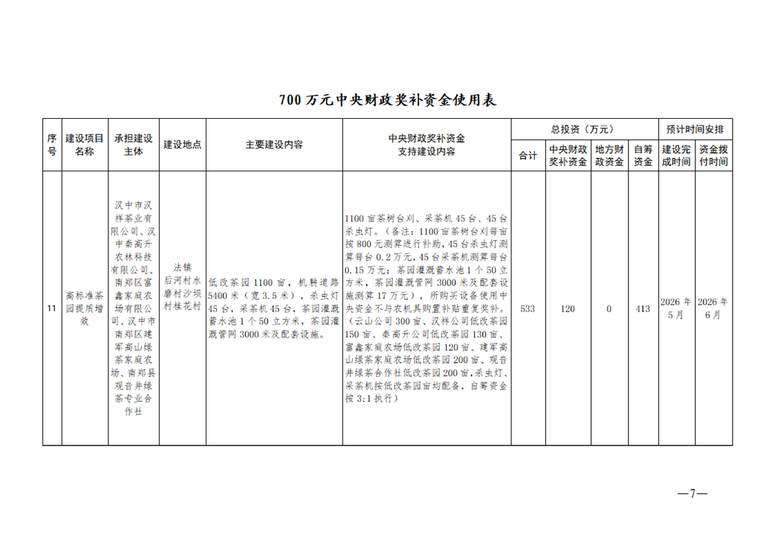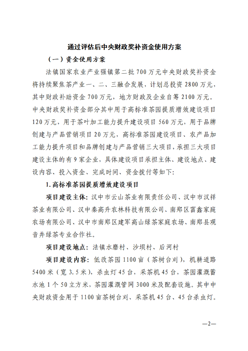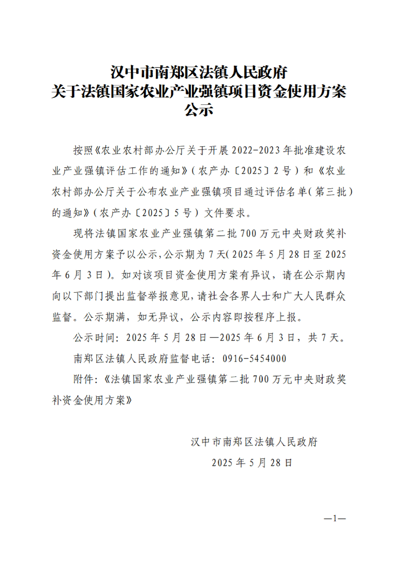 汉中市南郑区法镇人民政府关于法镇国家农业产业强镇项目资金使用方案公示