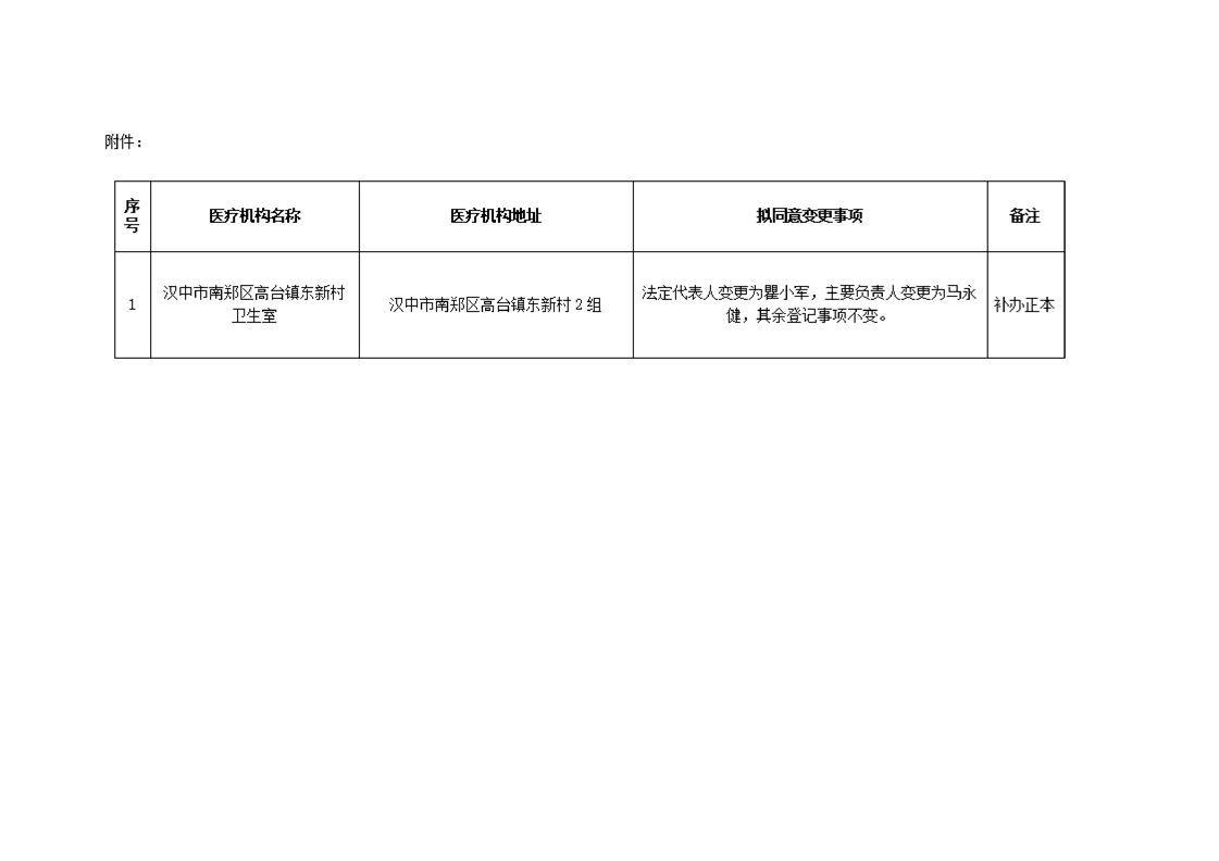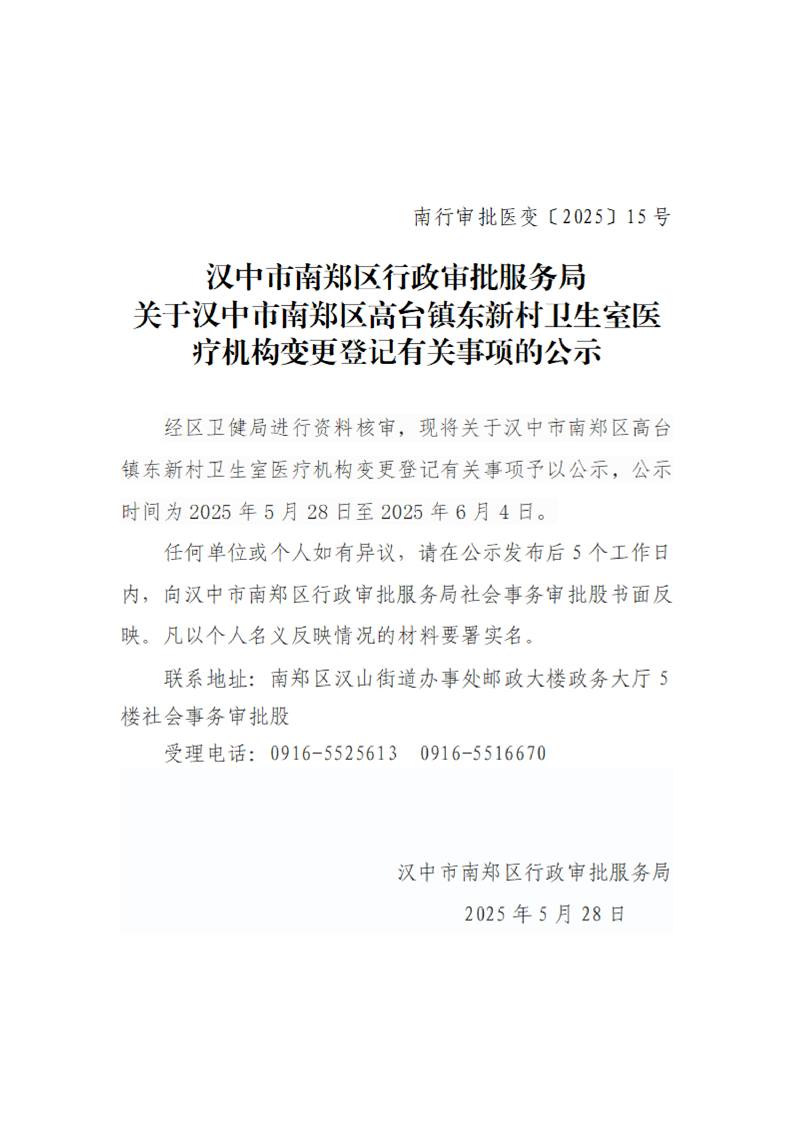 汉中市南郑区行政审批服务局关于汉中市南郑区高台镇东新村卫生室医疗机构变更登记有关事项的公示