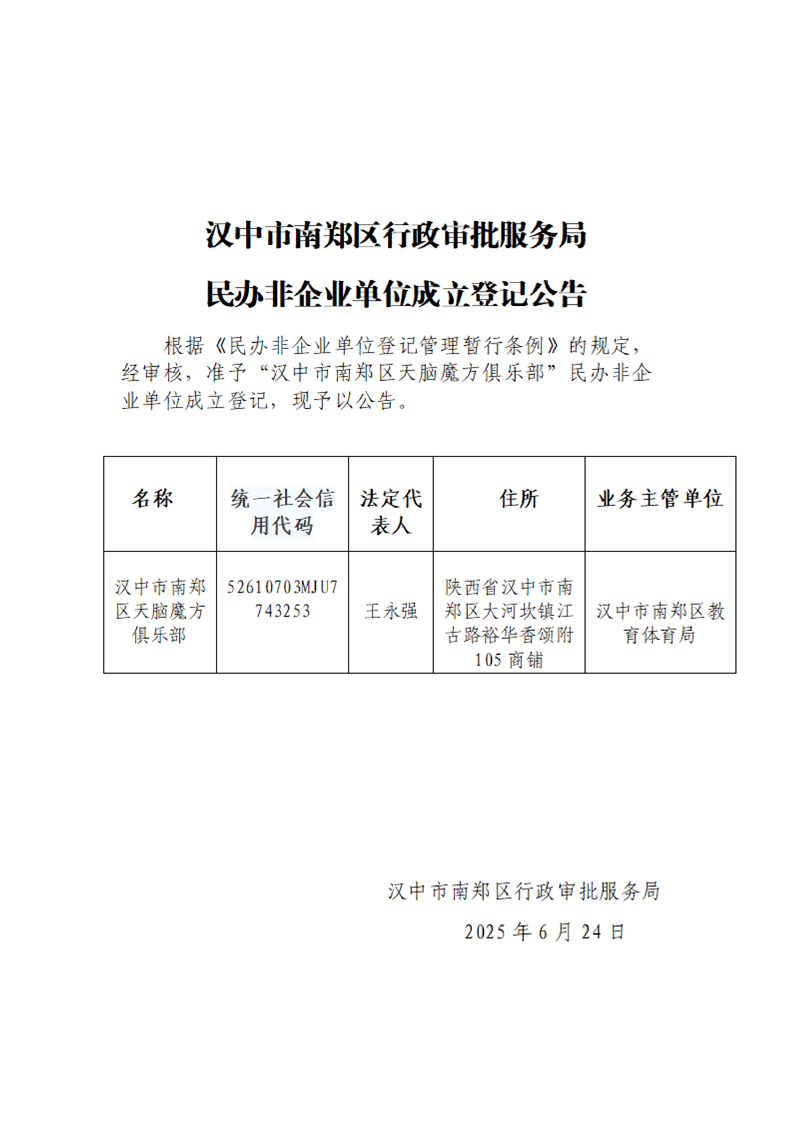 汉中市南郑区行政审批服务局民办非企业单位成立登记公告