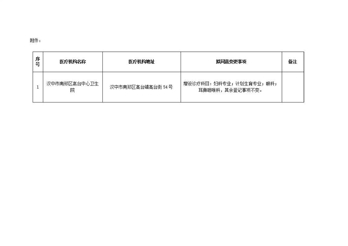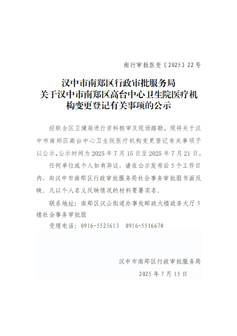 汉中市南郑区行政审批服务局关于汉中市南郑区高台中心卫生院医疗机构变更登记有关事项的公示