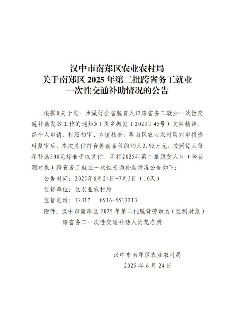 汉中市南郑区农业农村局关于南郑区2025年第二批跨省务工就业一次性交通补助情况的公告