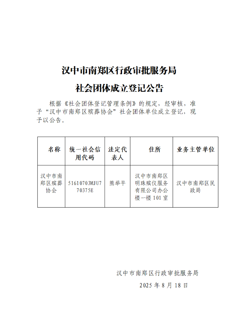 汉中市南郑区行政审批服务局社会团体成立登记公告