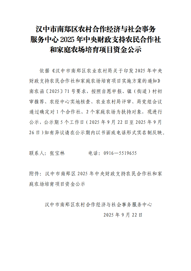 汉中市南郑区农村合作经济与社会事务服务中心2025年中央财政支持农民合作社和家庭农场培育项目资金公示