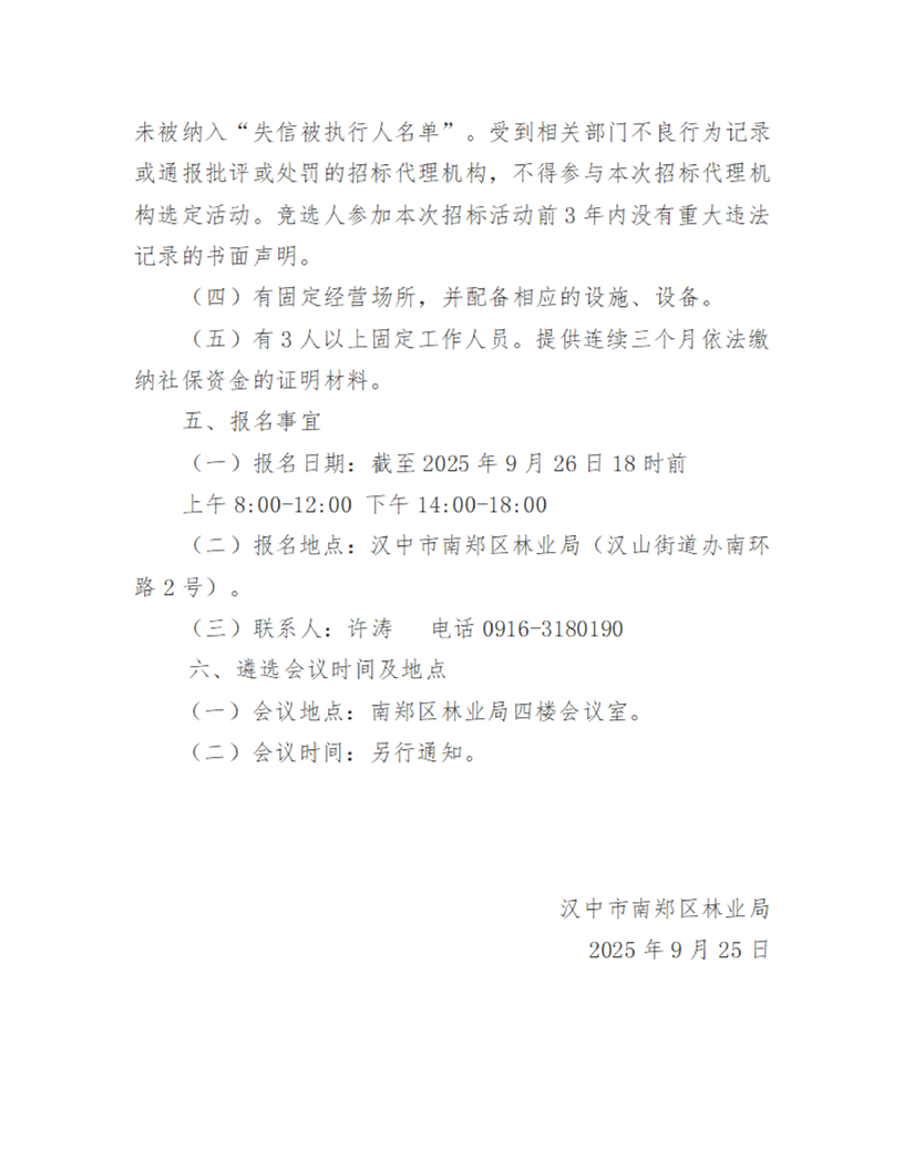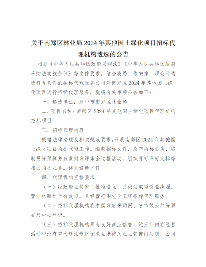 关于南郑区林业局2024年其他国土绿化项目招标代理机构遴选的公告