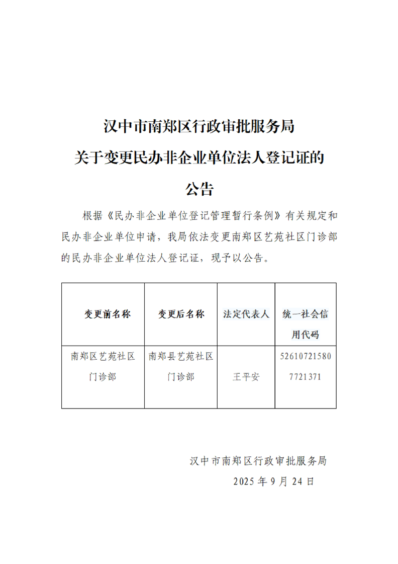 汉中市南郑区行政审批服务局关于变更民办非企业单位法人登记证的公告