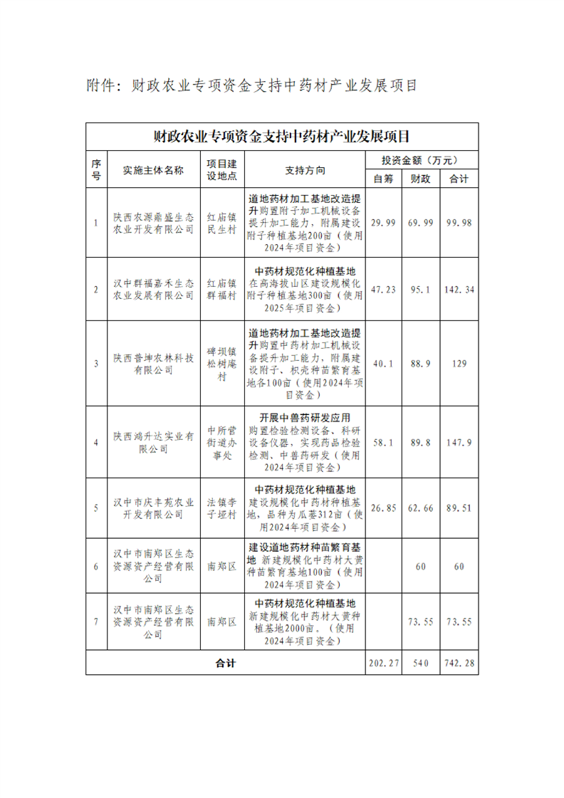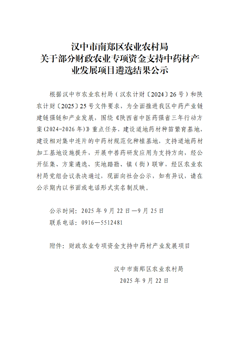 汉中市南郑区农业农村局关于部分财政农业专项资金支持中药材产业发展项目遴选结果公示