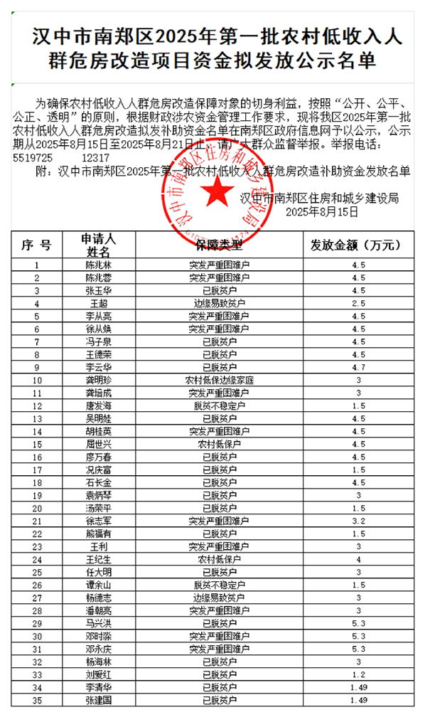 汉中市南郑区2025年第一批农村低收入人群危房改造项目资金拟发放公示名单