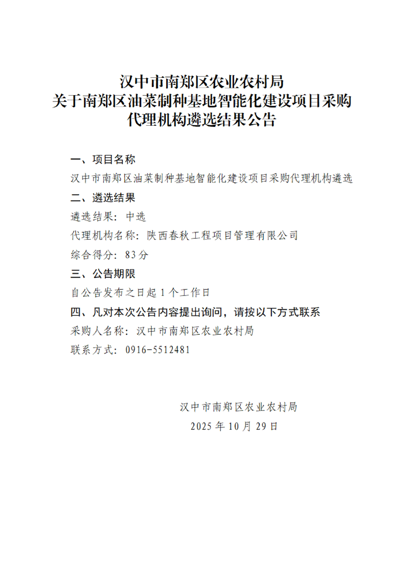 汉中市南郑区农业农村局关于南郑区油菜制种基地智能化建设项目采购代理机构遴选结果公告