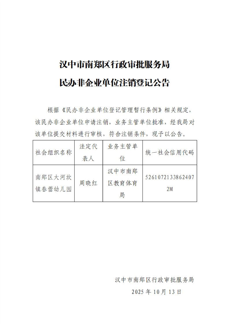 汉中市南郑区行政审批服务局民办非企业单位注销登记公告