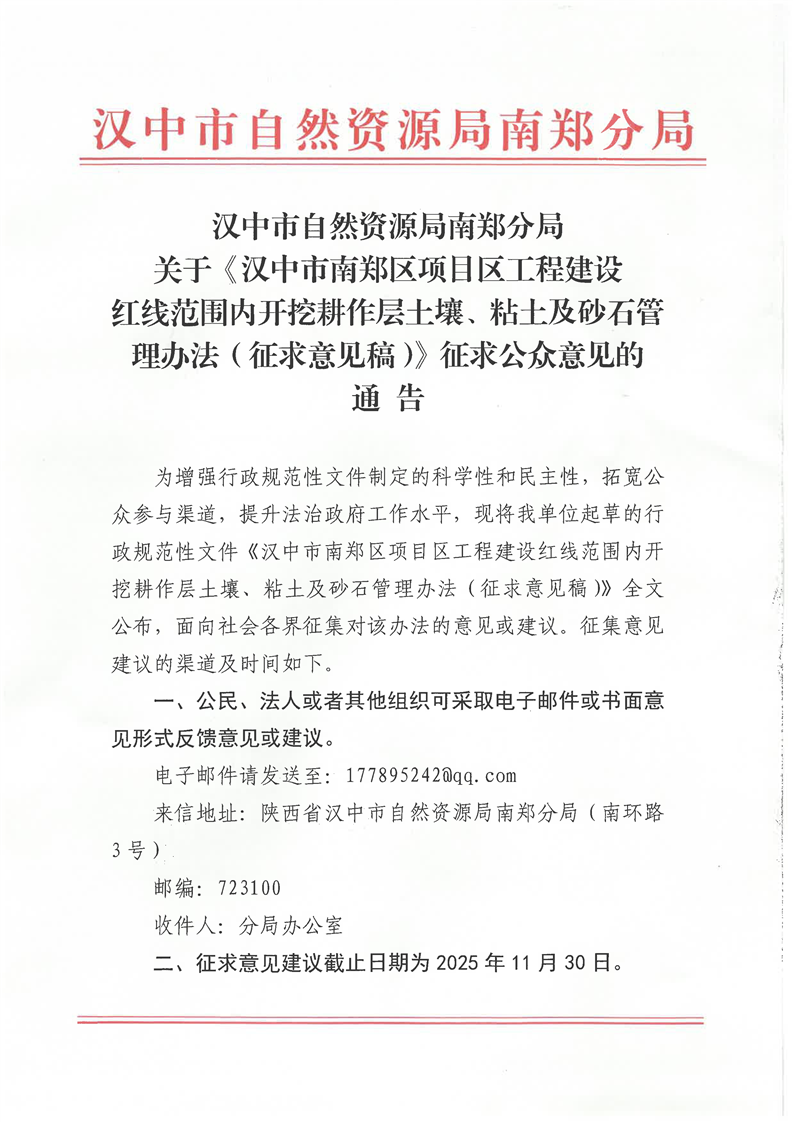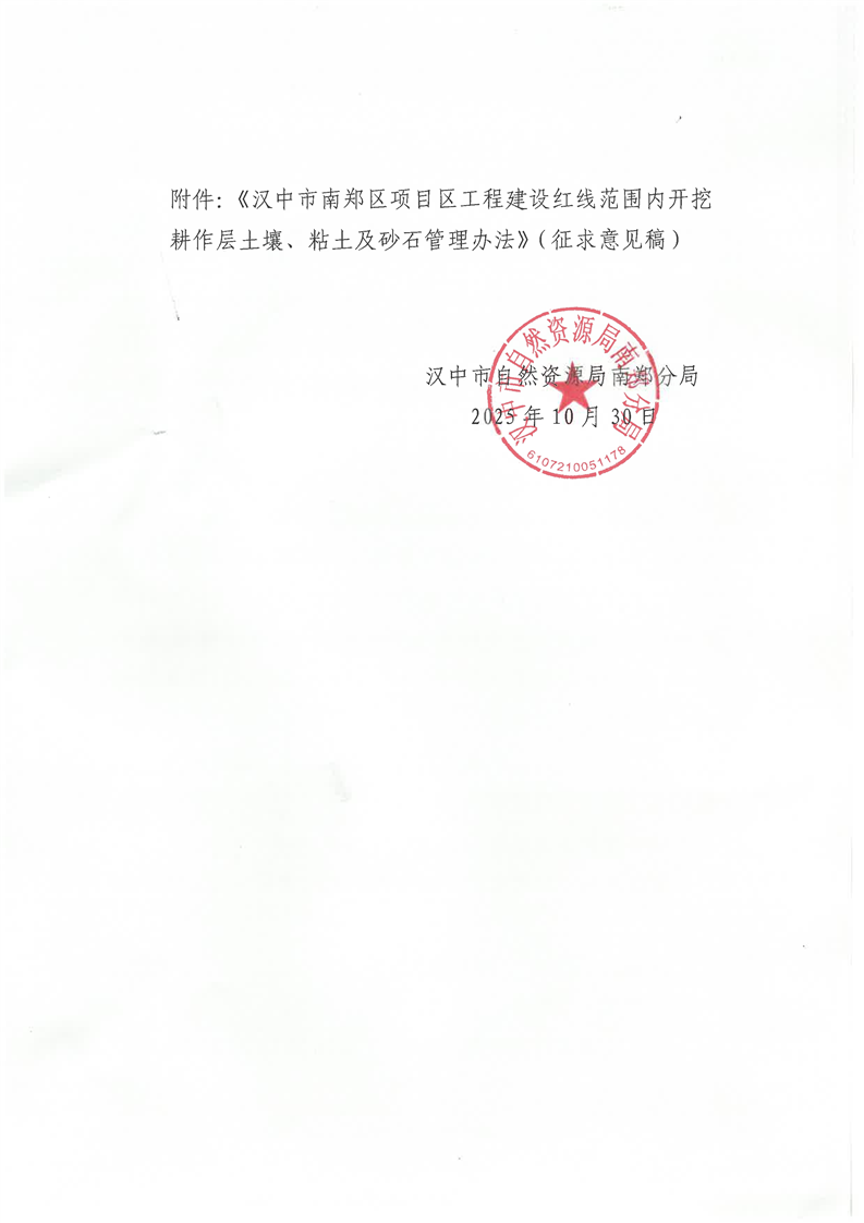 汉中市自然资源局南郑分局关于《汉中市南郑区项目区工程建设红线范围内开挖耕作层土壤、粘土及砂石管理办法(征求意见稿)》征求公众意见的通告