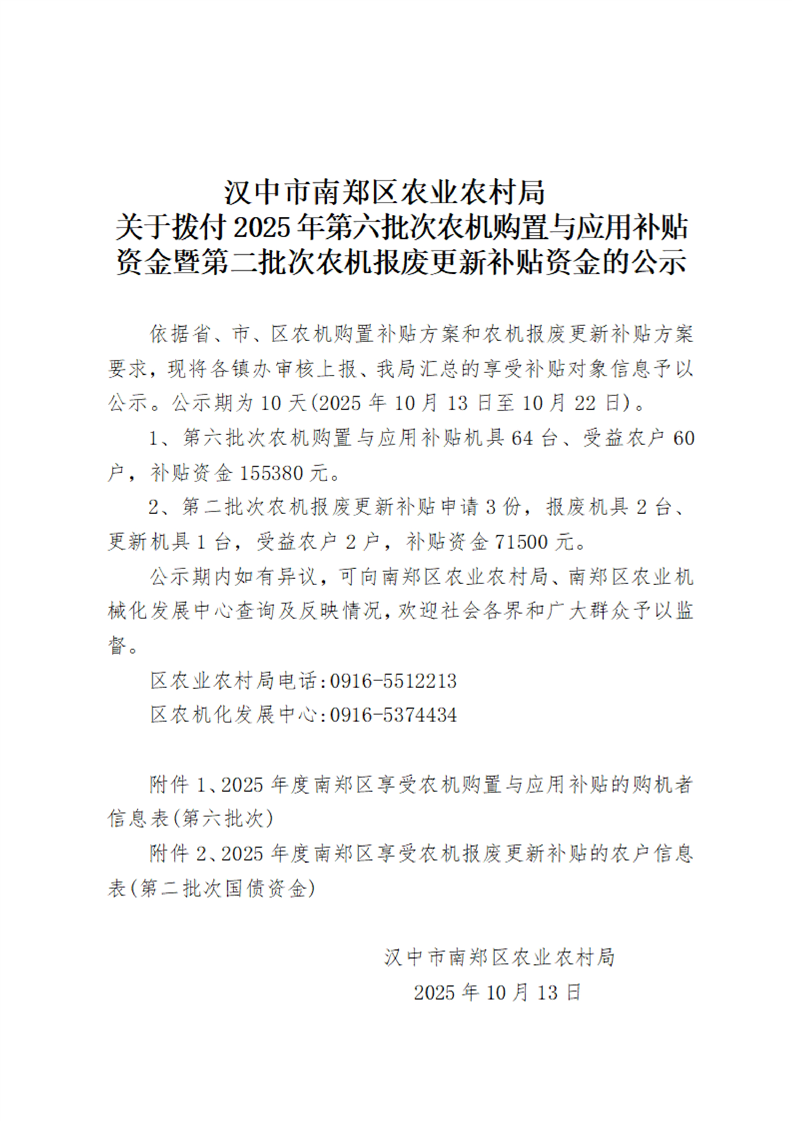 汉中市南郑区农业农村局关于拨付2025年第六批次农机购置与应用补贴资金暨第二批次农机报废更新补贴资金的公示