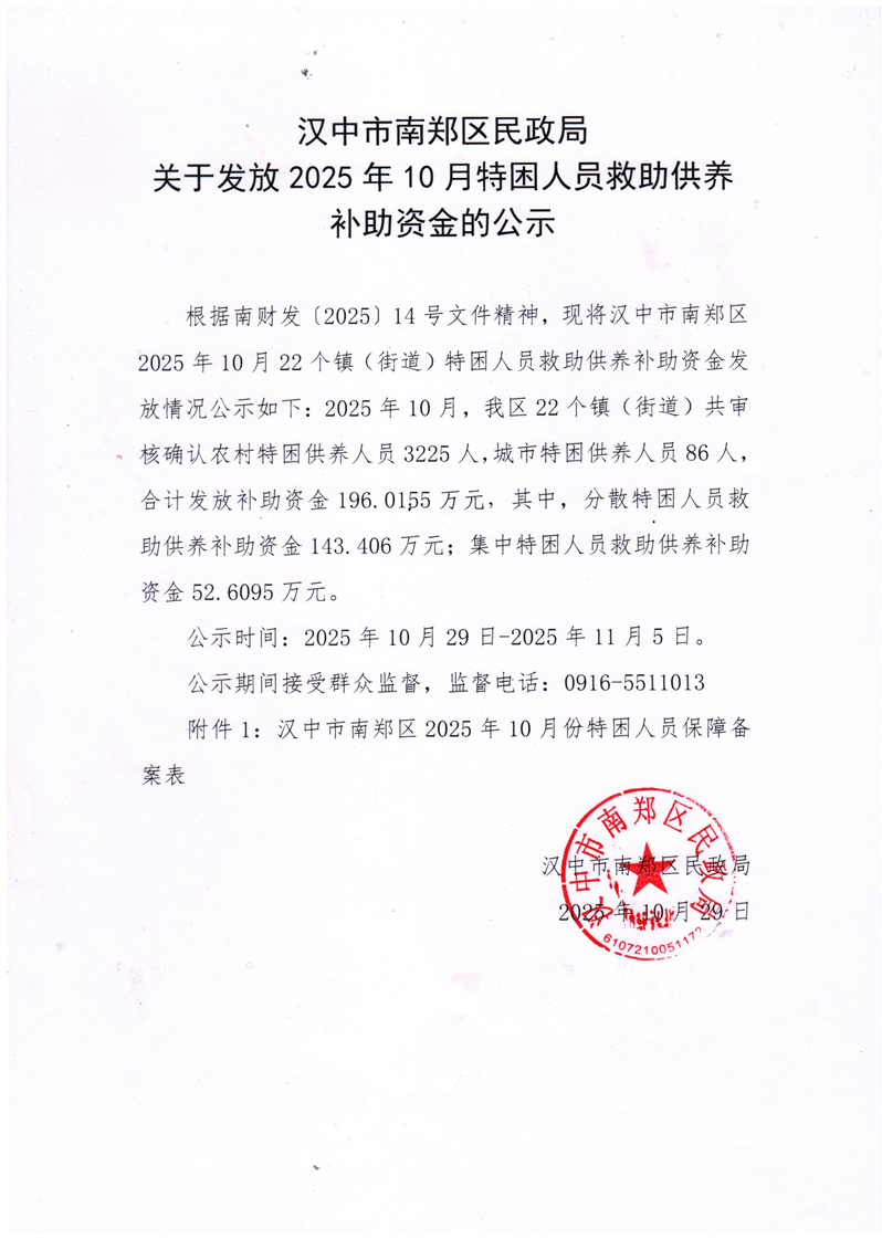 关于发放2025年10月特困人员救助供养补助资金的公示