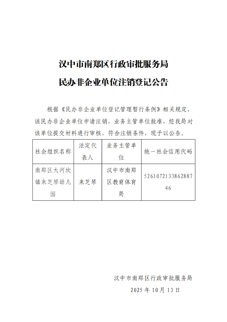 汉中市南郑区行政审批服务局民办非企业单位注销登记公告