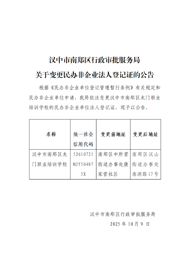 汉中市南郑区行政审批服务局关于变更民办非企业法人登记证的公告