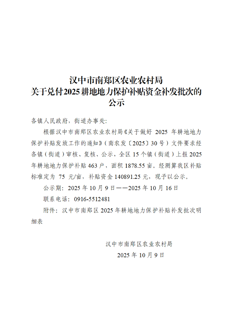 汉中市南郑区农业农村局关于兑付2025耕地地力保护补贴资金补发批次的公示