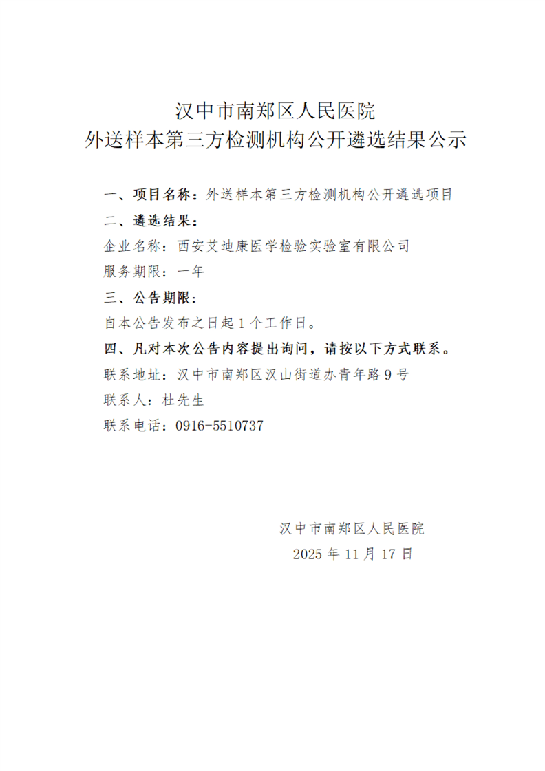 汉中市南郑区人民医院外送样本第三方检测机构公开遴选结果公示