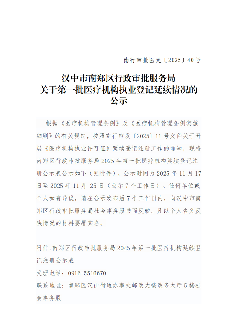 汉中市南郑区行政审批服务局关于第一批医疗机构执业登记延续情况的公示