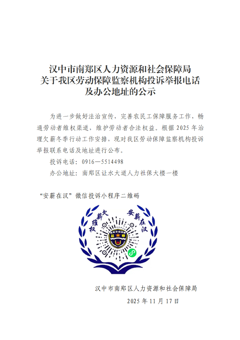 汉中市南郑区人力资源和社会保障局关于我区劳动保障监察机构投诉举报电话及办公地址的公示